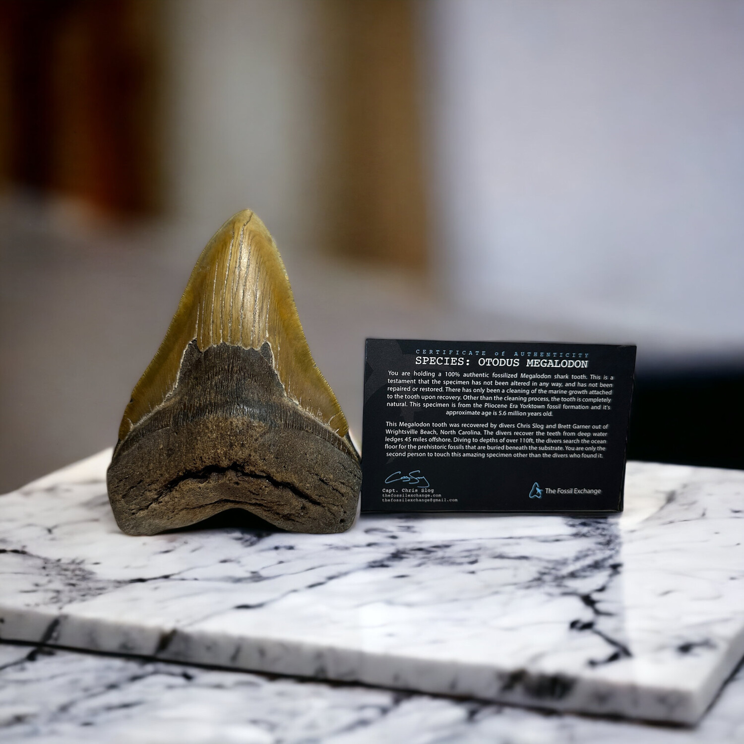 Dominating the Prehistoric Oceans for 13 Million years, Megalodon is the largest shark on record, reaching incredible lengths of up to 60 ft. This massive Megalodon Shark Tooth is a 100% real, unaltered fossil recovered by scuba divers in over 110 ft of water, 45 miles off the coast of North Carolina. The divers search the ocean floor for these fossils that are buried in the substrate. This incredible specimen includes a certificate of authenticity, along with a display stand so you can show off the impressive size of this gargantuan apex predator.