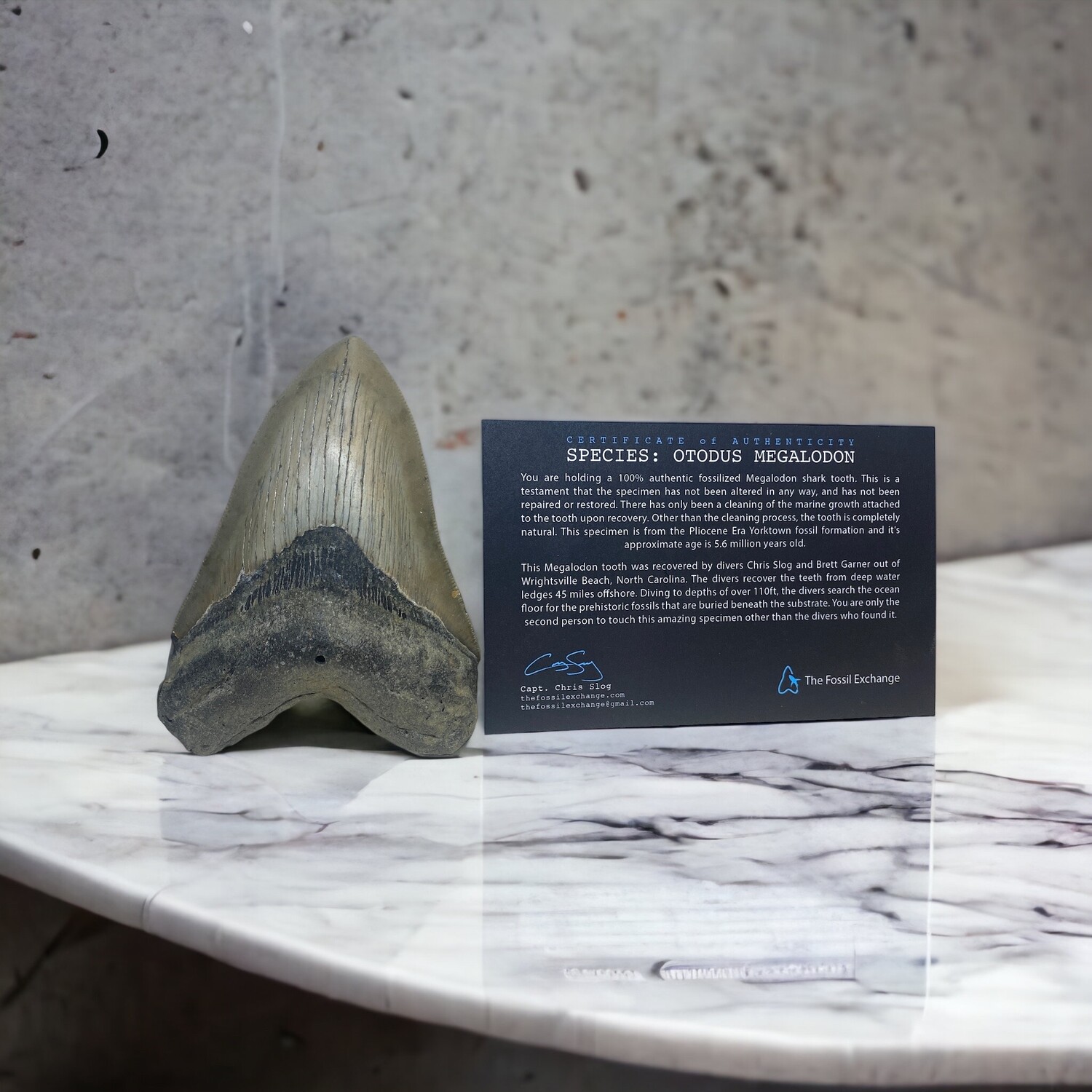 Dominating the Prehistoric Oceans for 13 Million years, Megalodon is the largest shark on record, reaching incredible lengths of up to 60 ft. This massive Megalodon Shark Tooth is a 100% real, unaltered fossil recovered by scuba divers in over 110 ft of water, 45 miles off the coast of North Carolina. The divers search the ocean floor for these fossils that are buried in the substrate. This incredible specimen includes a certificate of authenticity, along with a display stand so you can show off the impressive size of this gargantuan apex predator.