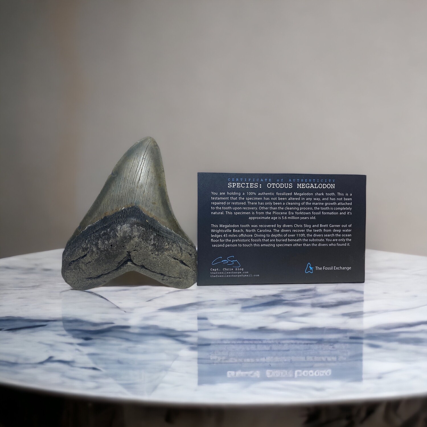 Dominating the Prehistoric Oceans for 13 Million years, Megalodon is the largest shark on record, reaching incredible lengths of up to 60 ft. This massive Megalodon Shark Tooth is a 100% real, unaltered fossil recovered by scuba divers in over 110 ft of water, 45 miles off the coast of North Carolina. The divers search the ocean floor for these fossils that are buried in the substrate. This incredible specimen includes a certificate of authenticity, along with a display stand so you can show off the impressive size of this gargantuan apex predator.