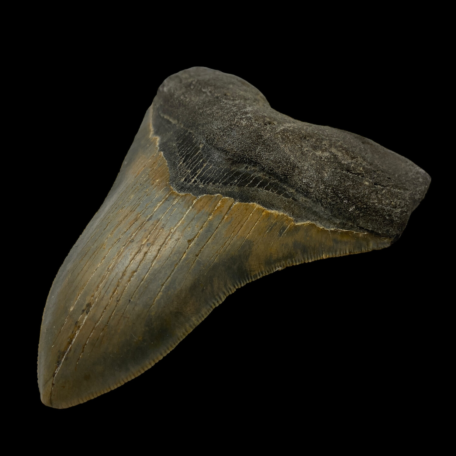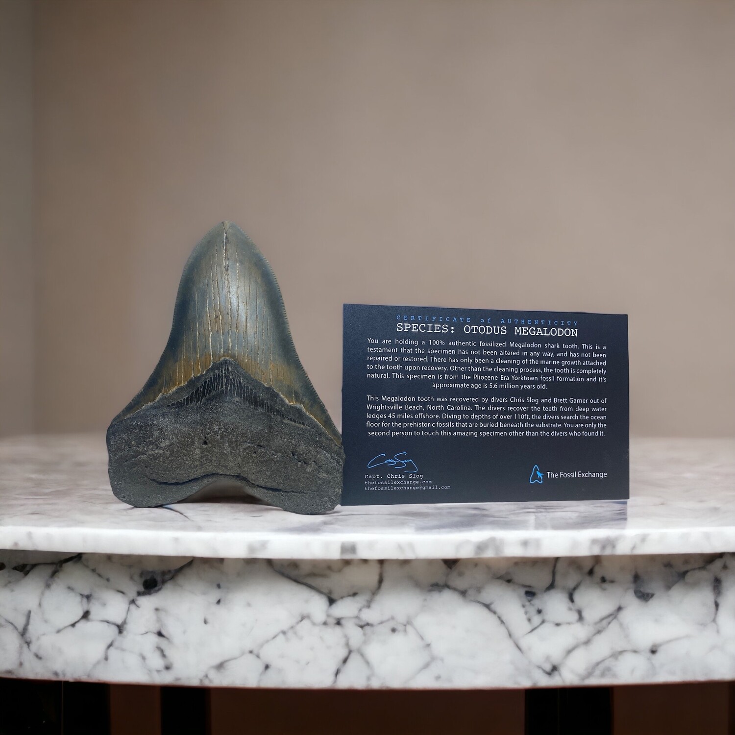 Dominating the Prehistoric Oceans for 13 Million years, Megalodon is the largest shark on record, reaching incredible lengths of up to 60 ft. This massive Megalodon Shark Tooth is a 100% real, unaltered fossil recovered by scuba divers in over 110 ft of water, 45 miles off the coast of North Carolina. The divers search the ocean floor for these fossils that are buried in the substrate. This incredible specimen includes a certificate of authenticity, along with a display stand so you can show off the impressive size of this gargantuan apex predator.