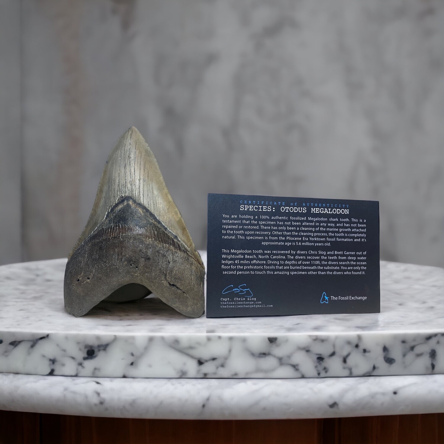 Dominating the Prehistoric Oceans for 13 Million years, Megalodon is the largest shark on record, reaching incredible lengths of up to 60 ft. This massive Megalodon Shark Tooth is a 100% real, unaltered fossil recovered by scuba divers in over 110 ft of water, 45 miles off the coast of North Carolina. The divers search the ocean floor for these fossils that are buried in the substrate. This incredible specimen includes a certificate of authenticity, along with a display stand so you can show off the impressive size of this gargantuan apex predator.