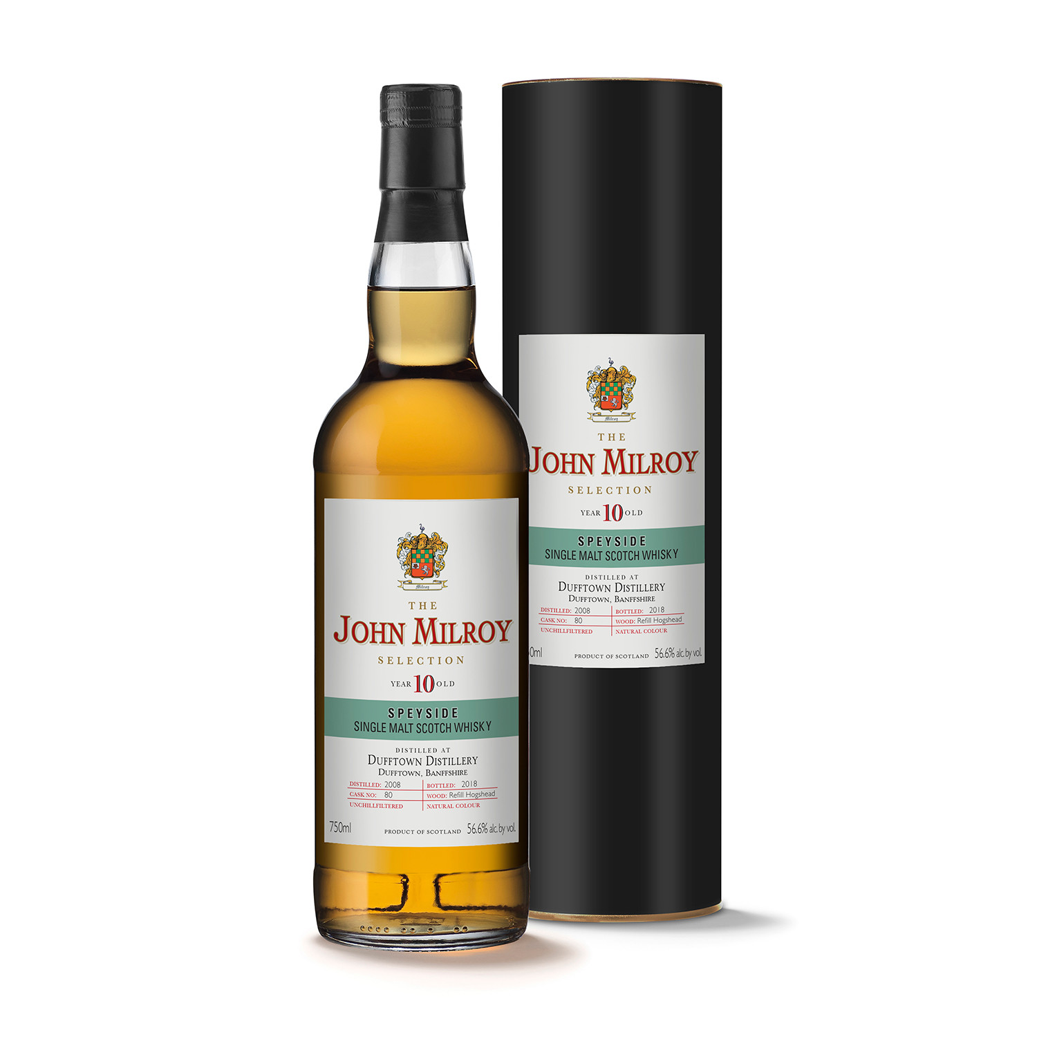 The John Milroy Dufftown 2008 10 Year Scotch Whisky from the Speyside region features soft, fresh, and fruity notes with grassy, toasty and earthy nuances. Whiskies from the Dufftown distillery are virtually unavailable in the United States.