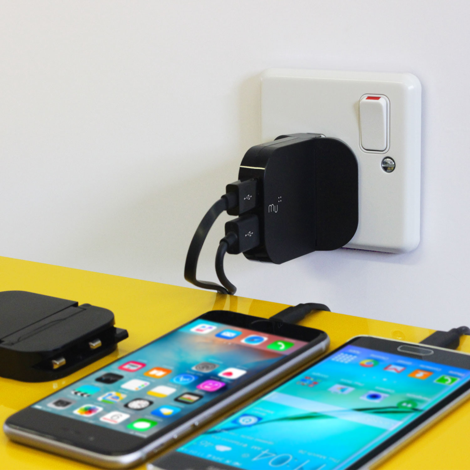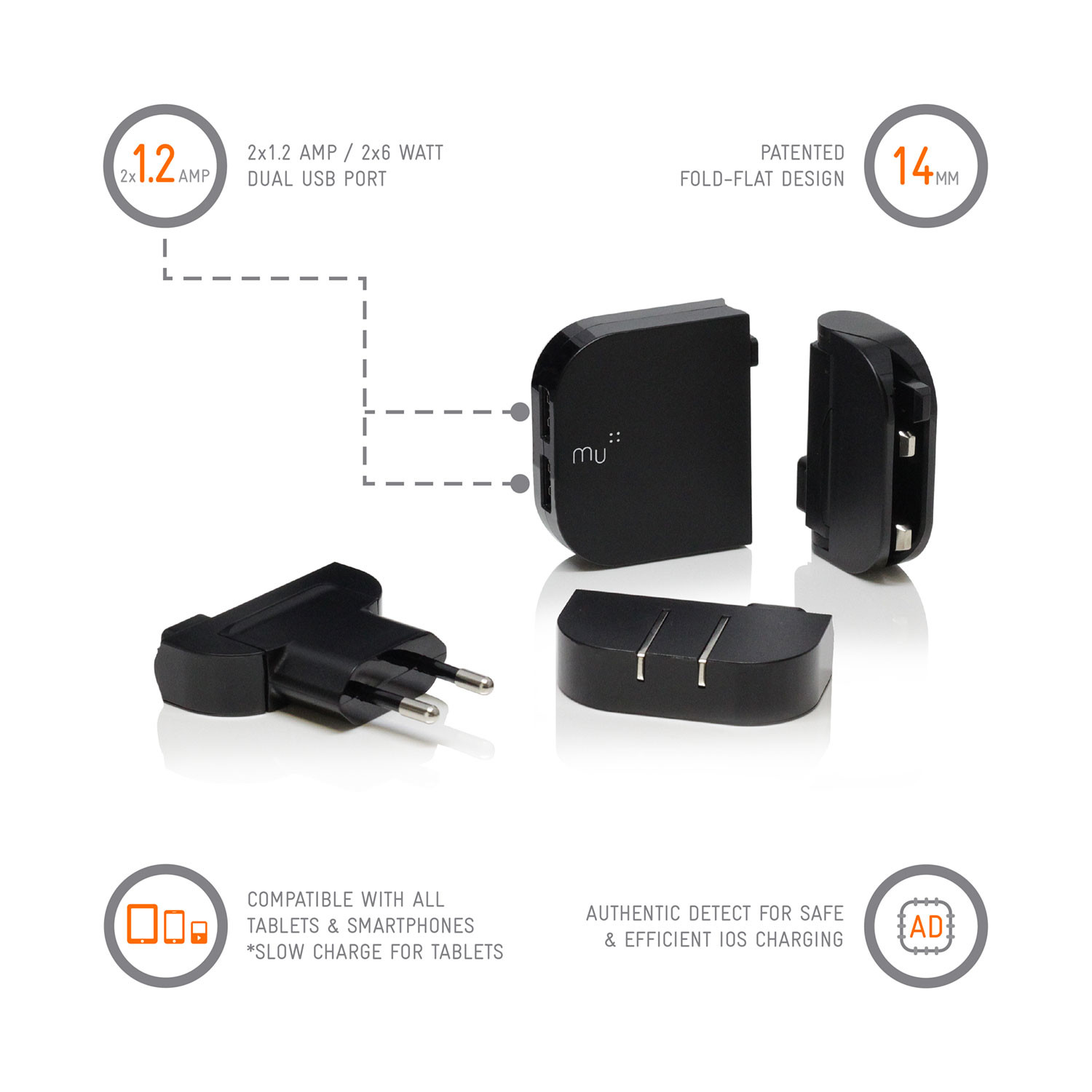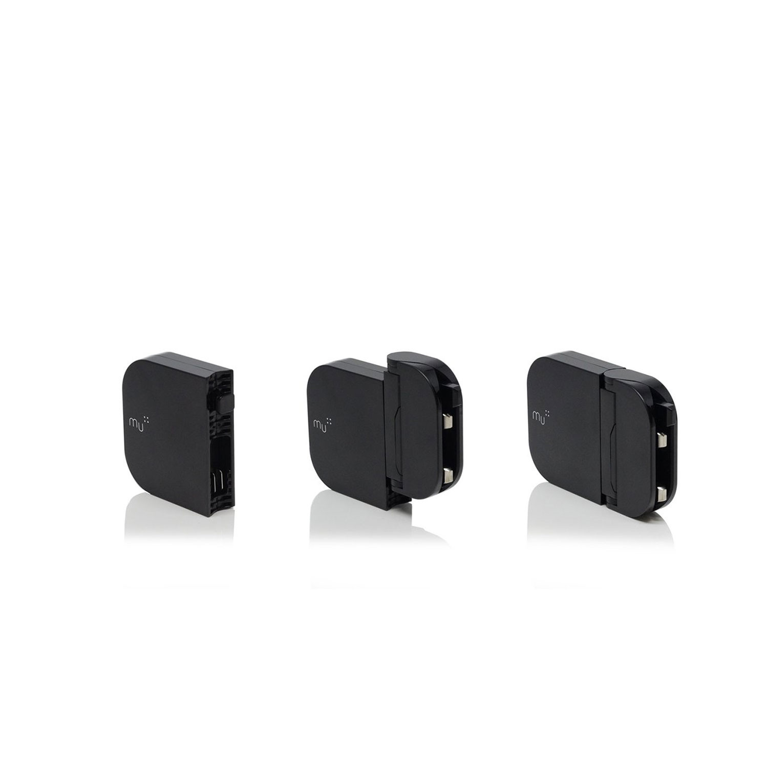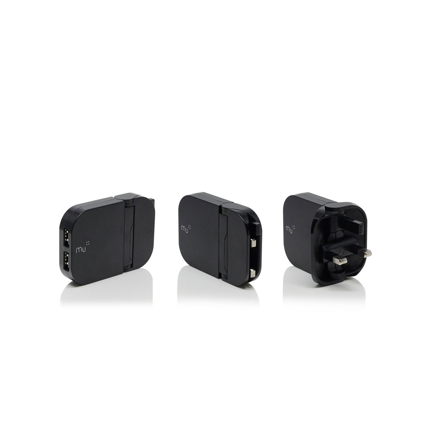 The Mu World Traveller is a worldwide USB adapter, and a single port, fast charge 2.4 amp. It contains the necessary adapters to charge your favorite devices in UK, US, and EU outlets. And it holds enough power to charge your small devices on the go. It's also designed to carry with you. Simply fold it, pop it in your pocket, and charge on the go, no matter where your adventures take you.