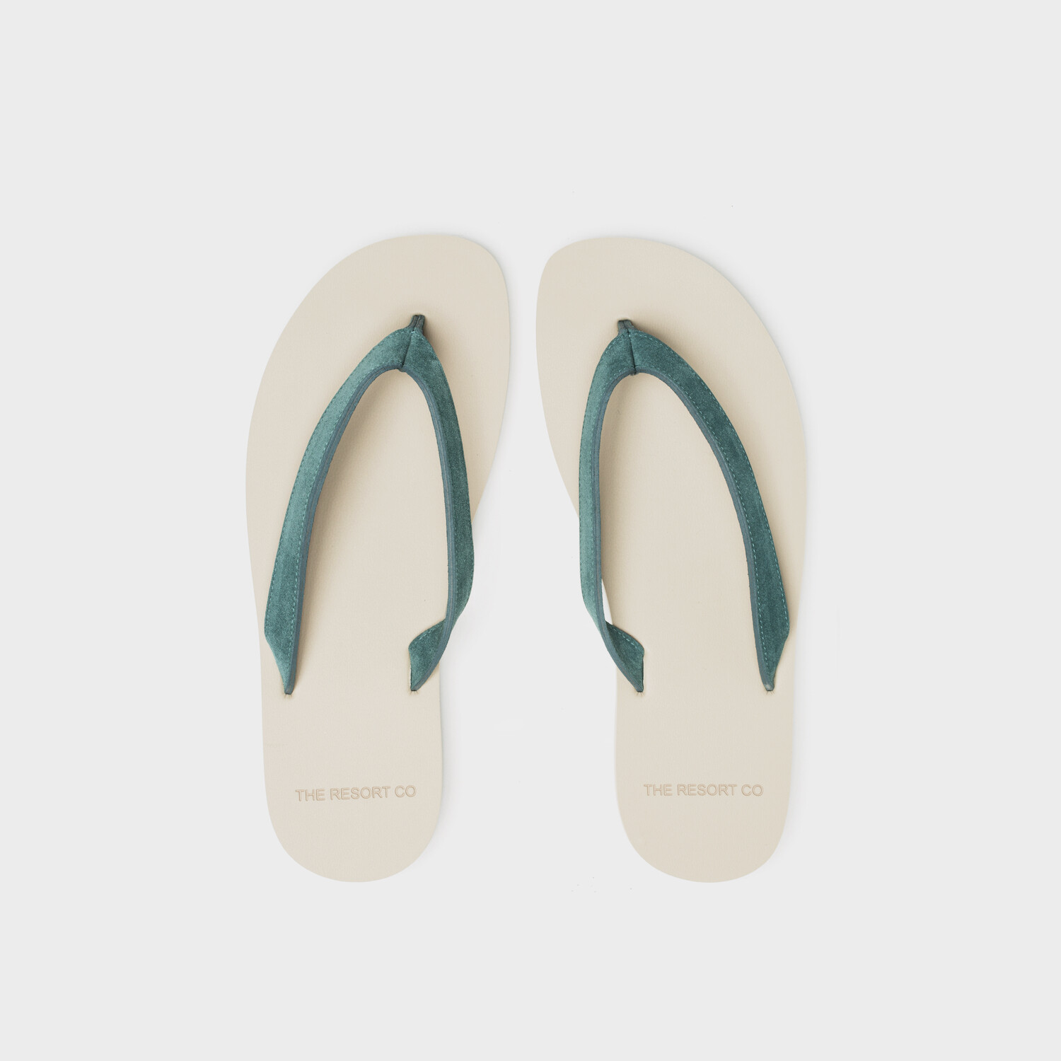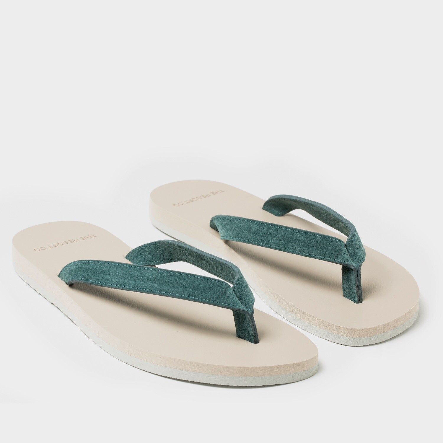 These flip-flops are handcrafted in Italy and combine superior comfort and quality with an understated luxury design. Sustainable EVA soles and turquoise suede straps.