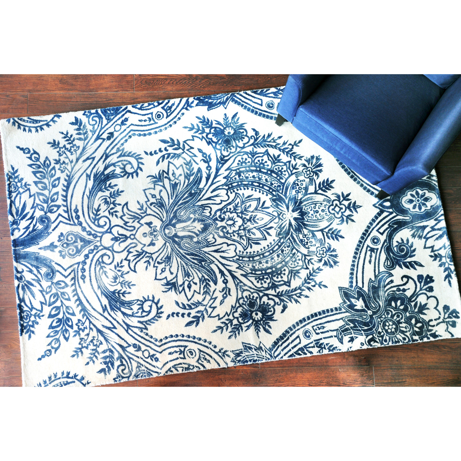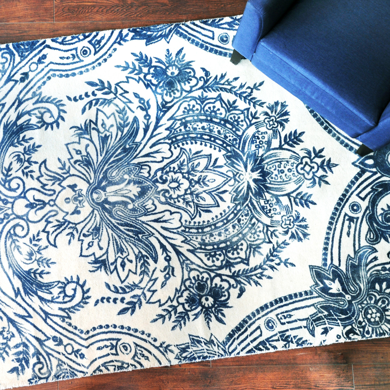 An incredibly delicate combination of blue and white creates a fine china-like pattern in this incredible rug. Rivoli, like other rugs made of wool, is resistant to wear and tear and can look like new for years. Extremely soft and comfortable to walk on, it will both prevent accumulation of static electricity and give an additional warmth to your room, all while gently reflecting light throughout the space.