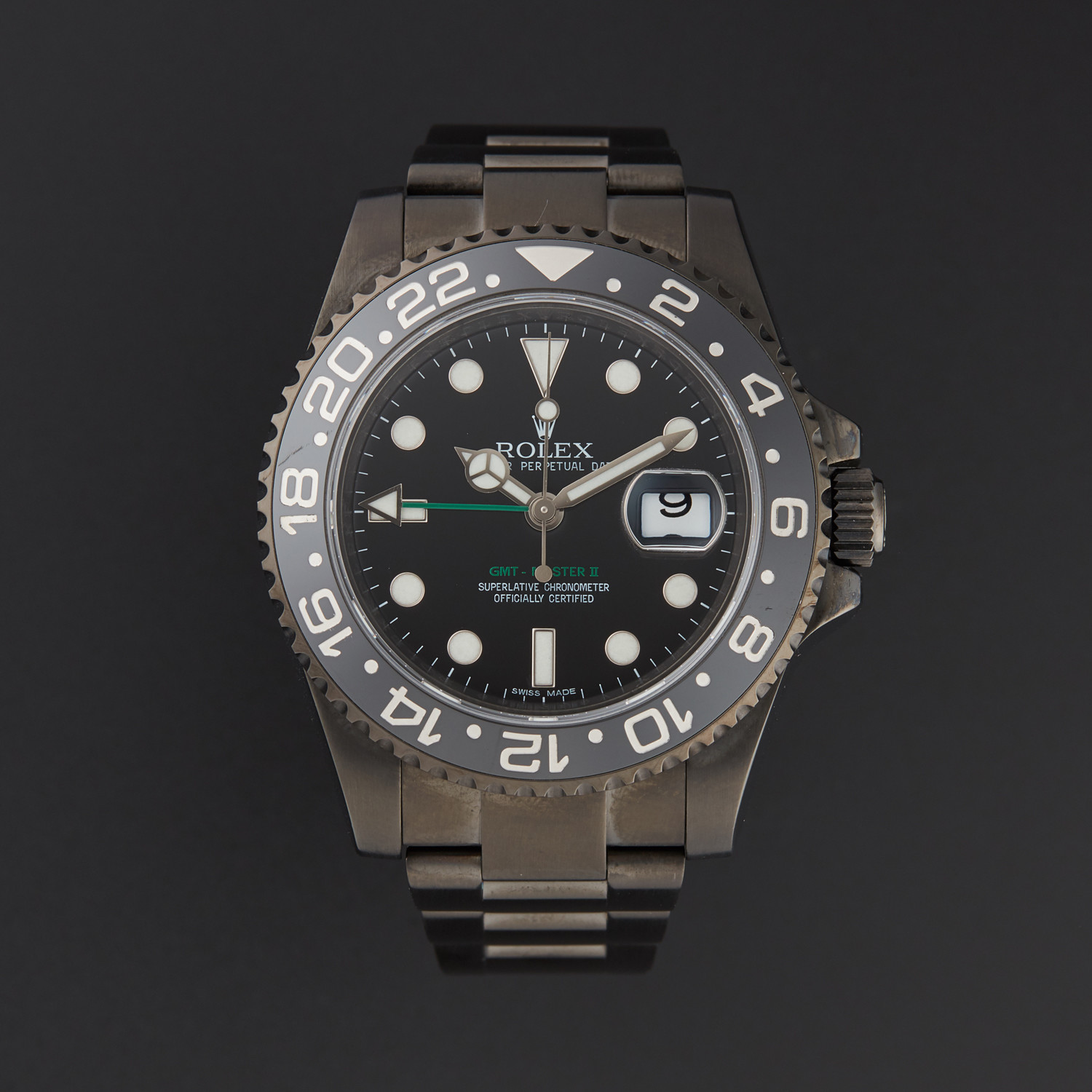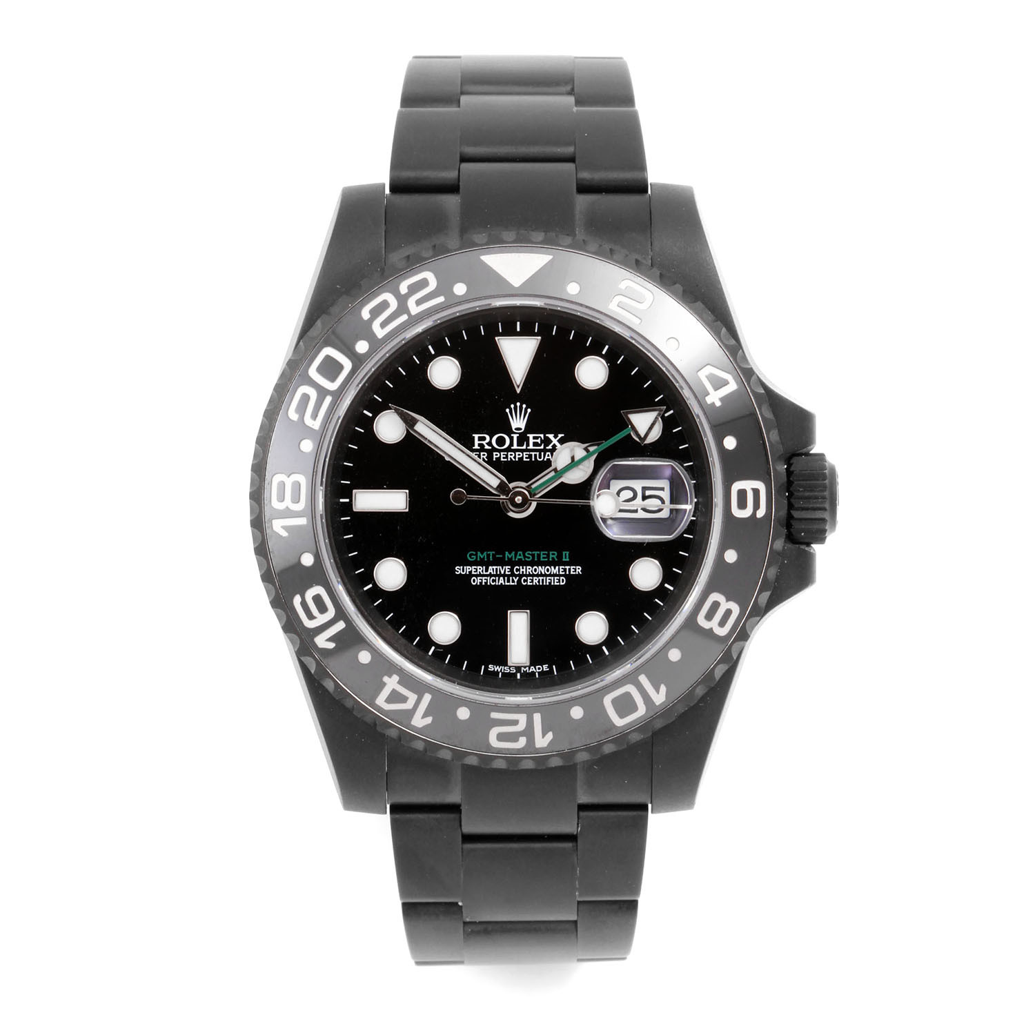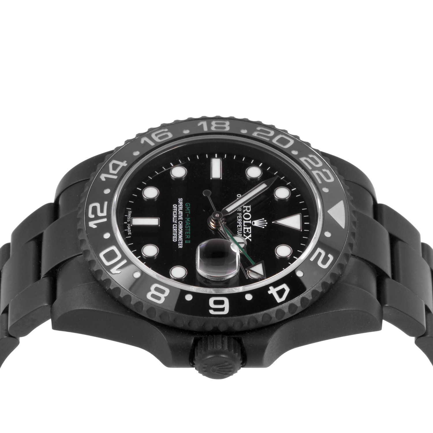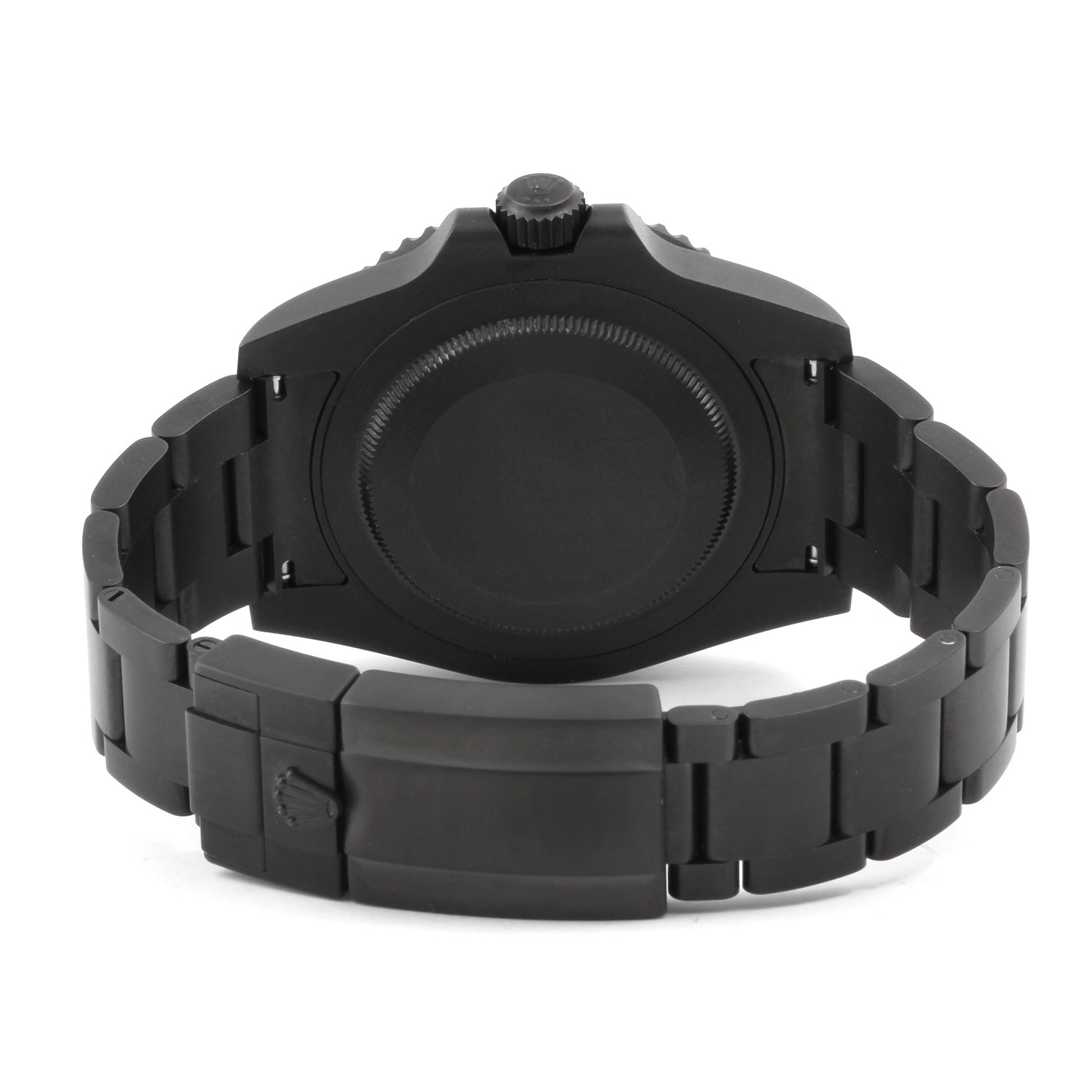 This Rolex has been carefully inspected, restored, and protected with an all-black PVD coating. The process involves completely disassembling the watch and placing it in a vacuum chamber to be blasted with a DLC (Diamond-Like Carbon) coating.