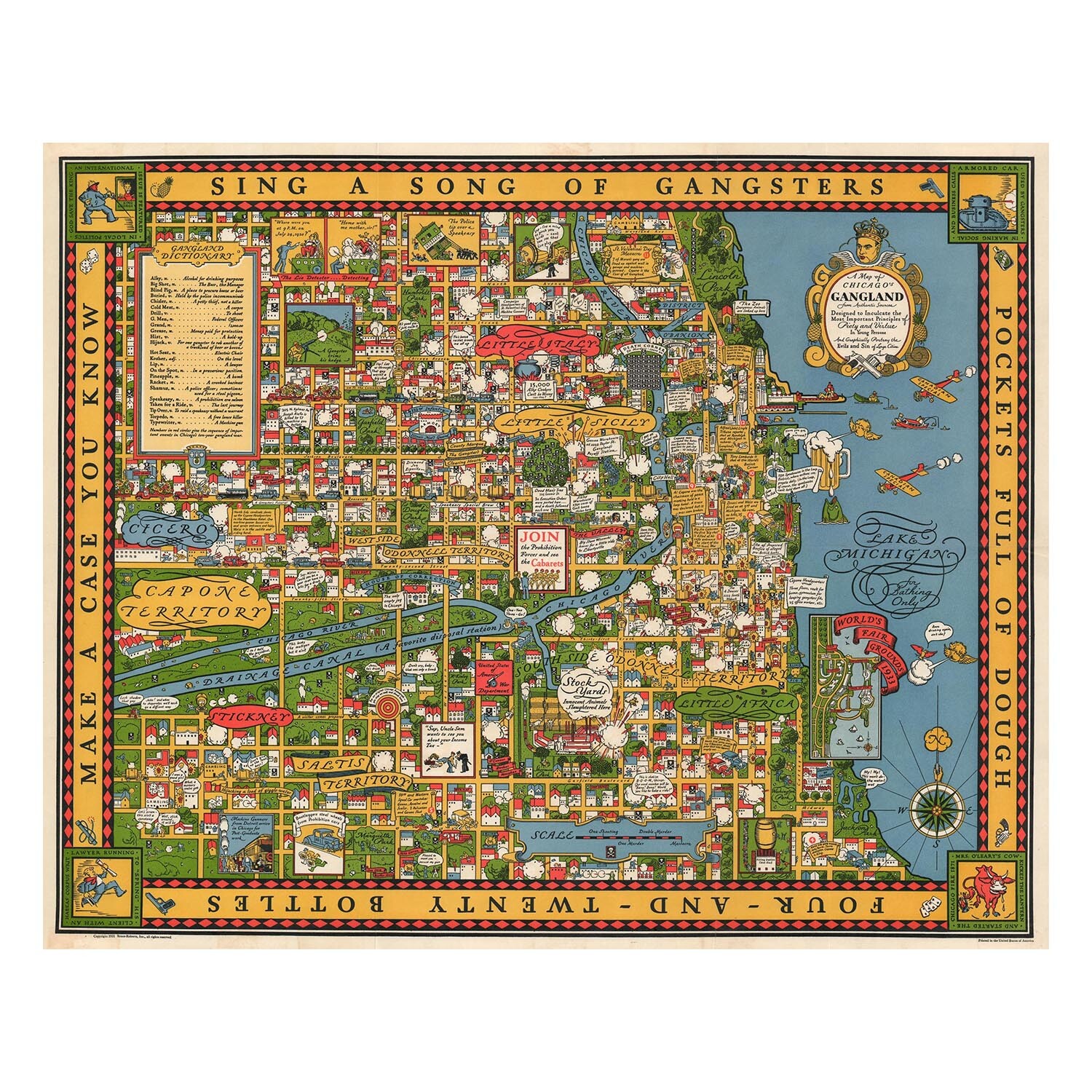 This is a fine print reproduction of the extremely rare "Gangland Map of Chicago," originally published in 1931 by Bruce-Roberts Inc. This pictorial map depicts Chicago during its notorious era of organized crime in the 1920s and early 1930s. At that time, Chicago’s lawlessness was an object of media fascination, receiving copious coverage in national newspapers and serving as dramatic fodder for many Hollywood scriptwriters.