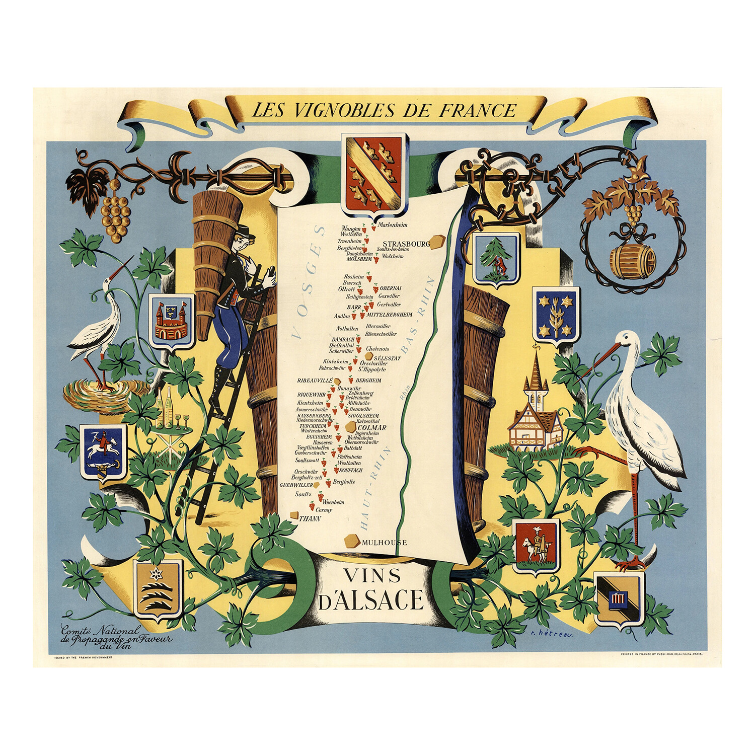 The title is contained in a ribbon cartouche at the top of the map. Here Hetreau presents a scroll background on which are positioned a young man climbing a ladder to a massive barrel of grapes to which he is depositing another batch. A variety of crests (seven in total) surround the map, along with an adorable chateaux and table with two bottles and glasses of wine. Featured prominently on either side of the map are two large birds resembling Egrets that stand prominently. The map shows a large number of vineyards between the towns of Mulhouse, Thann, Colmar, Selestat, and Strasbourg along the Rhine River.