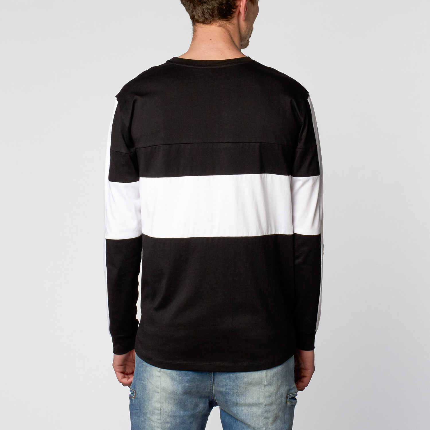 The 100% Long Sleeve Tee is 100% your best bet for looking good. Striped cut-and-sew panels give off an early nineties vibe.