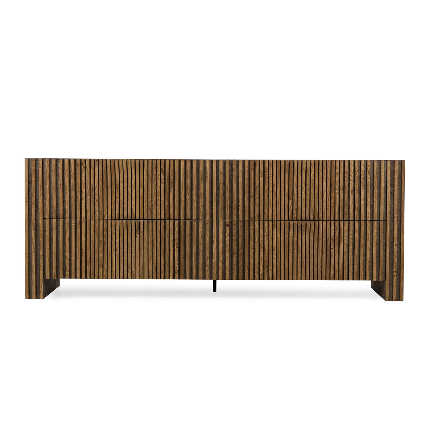 The Thomas Bina collection is comprised of a sophisticated blend of lighter and more evocative materials with a sculptural attention to detail. This Angelica Dresser has an unusual and beautiful textural front surface, perfectly matched to the Angelica Bed also in this sale.