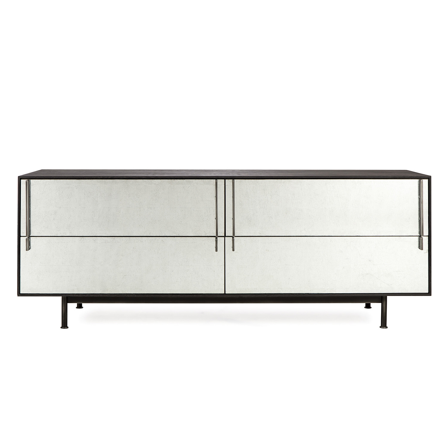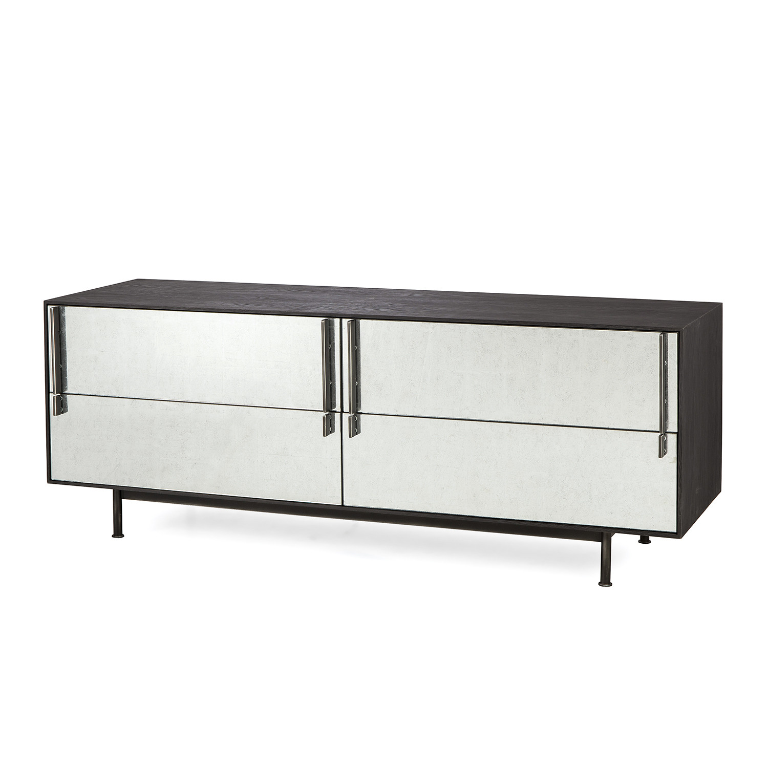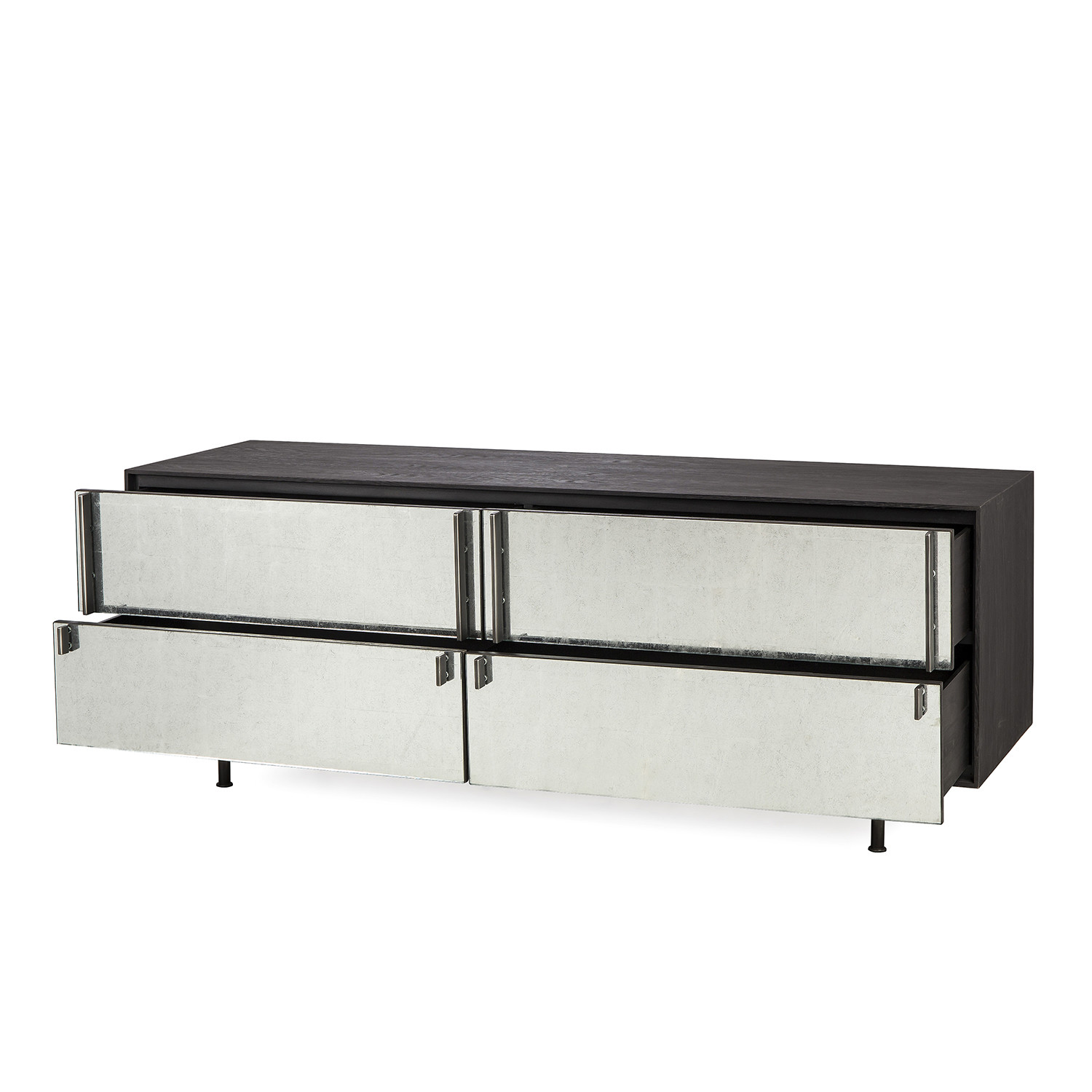 The Thomas Bina collection is comprised of a sophisticated blend of lighter and more evocative materials with a sculptural attention to detail. This Marimar Dresser combines unusual materials, such as silver leaf, dyed black oak, and steel. Four drawers give it the storage convenience to match its stylistic prowess.