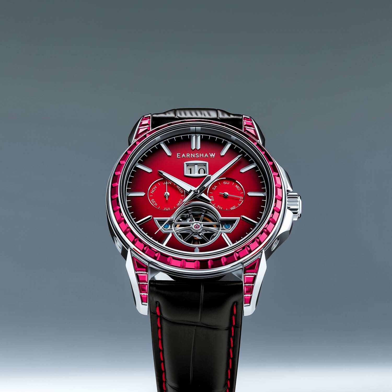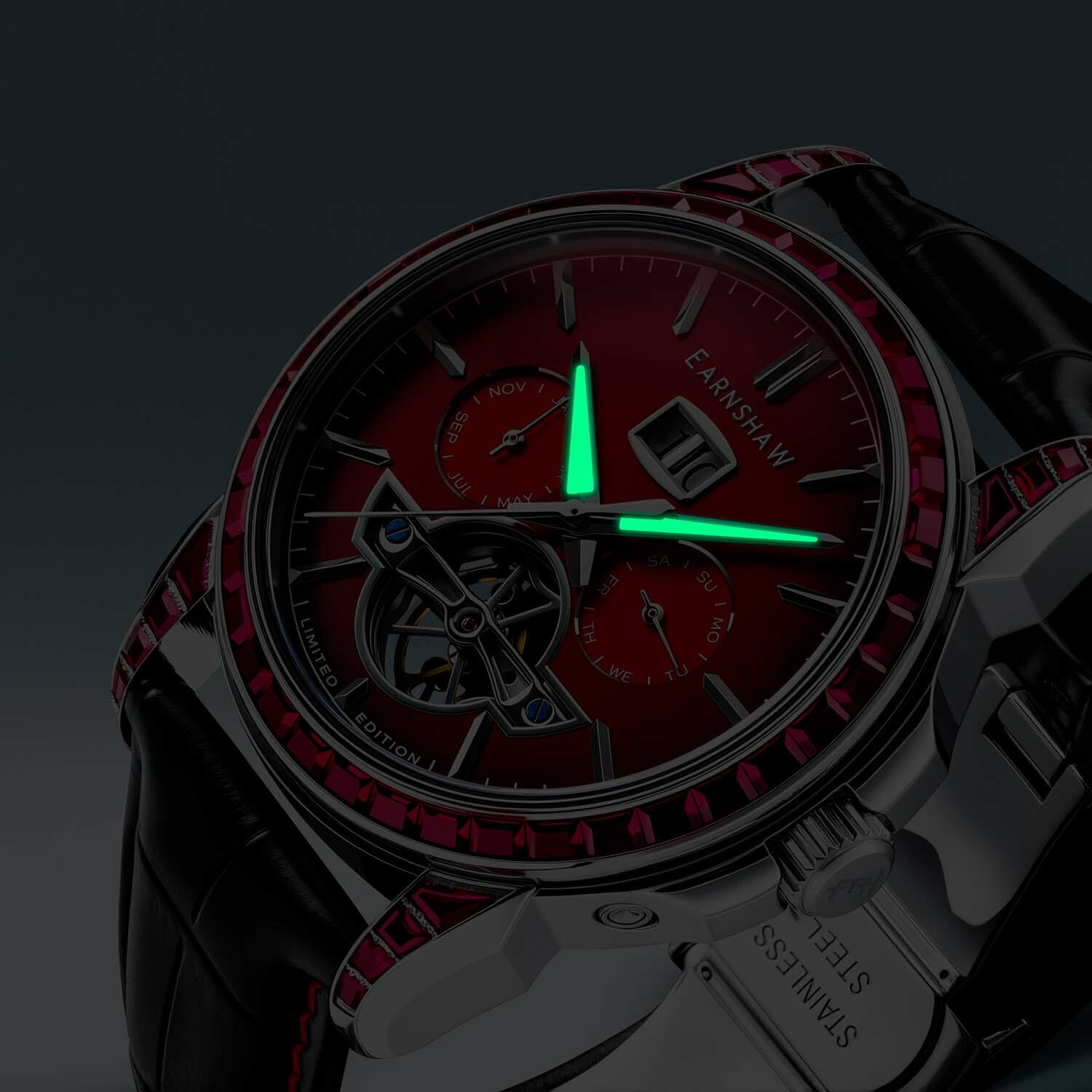 MOVEMENT: M-SG-TY2625-3A CASE MATERIAL: STAINLESS STEEL CASE DIAMETER (MM):43 CASE SHAPE: ROUND CASE COLOR: STAINLESS STEEL DIAL COLOR: RED BAND: GENUINE LEATHER STRAP BAND COLOR: BLACK WATER RESISTANCE: 5 ATM LIMITED EDITION: 001-100/100 INCLUDED: -ES-IFCARD-01 -LE CARD FULL PACK WITH ES-BOX-23