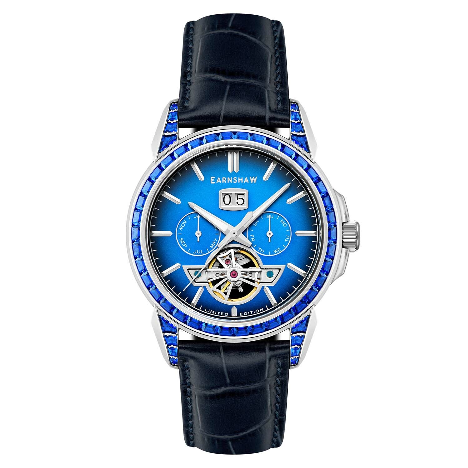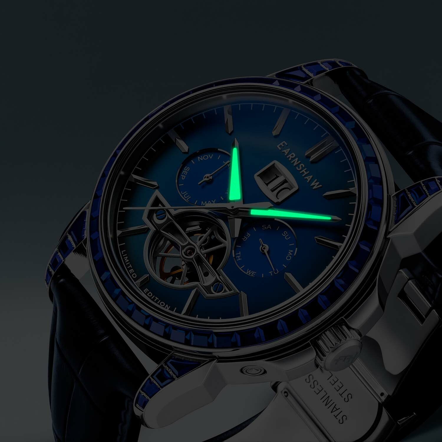 MOVEMENT: M-SG-TY2625-3A CASE MATERIAL: STAINLESS STEEL CASE DIAMETER (MM):43 CASE SHAPE: ROUND CASE COLOR: STAINLESS STEEL DIAL COLOR: BLUE BAND: GENUINE LEATHER STRAP BAND COLOR: BLUE WATER RESISTANCE: 5 ATM LIMITED EDITION: 001-100/100 INCLUDED: -ES-IFCARD-01 -LE CARD FULL PACK WITH ES-BOX-23