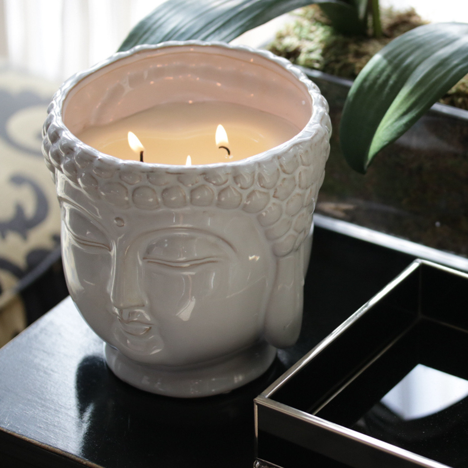 The Buddha 3-wick scented candle is hand-sculpted and hand-poured in the USA. Each vessel is filled with highly fragranced essential oils and a proprietary soy wax blend, with 3 lead-free cotton wicks to provide a cleaner burn.