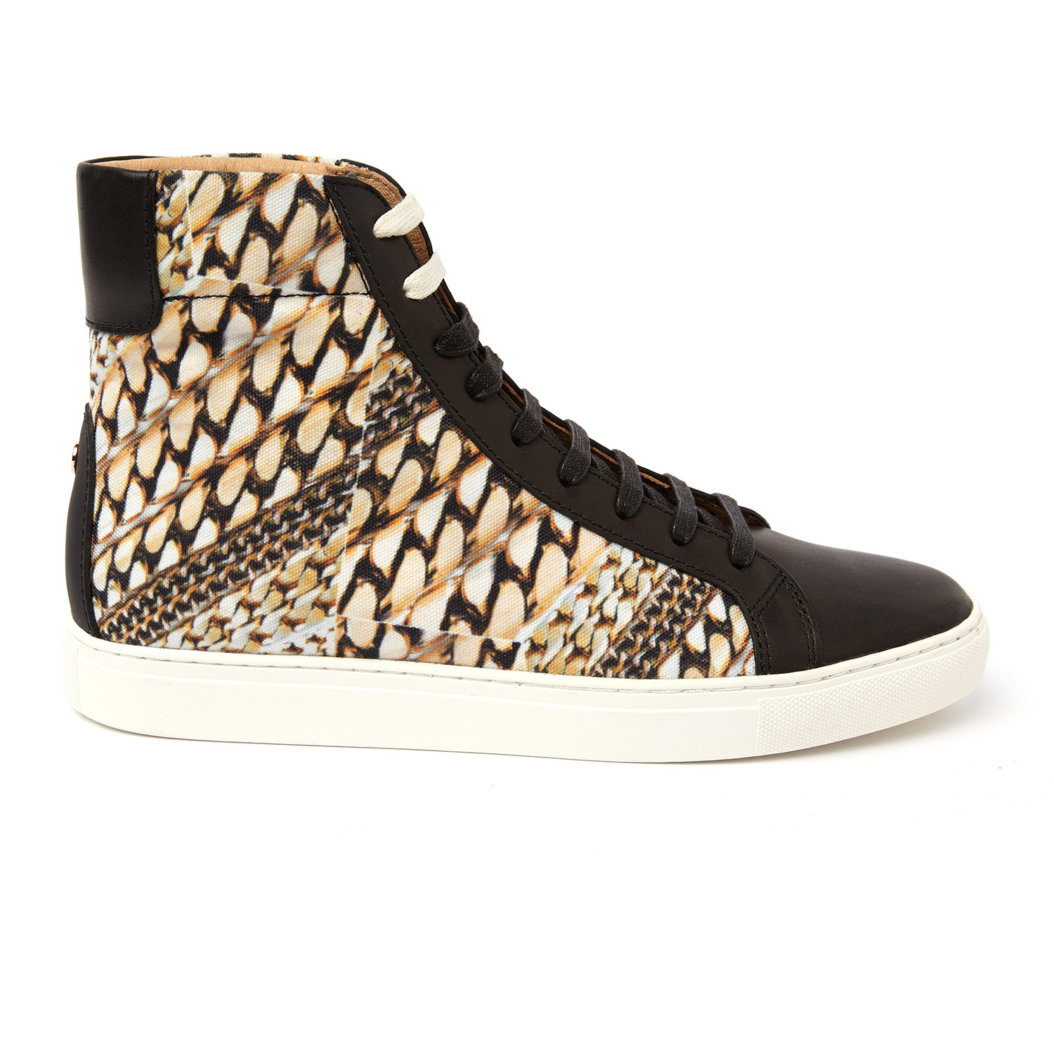 The Logan Gold Chain high-top trainer is produced in very limited numbers and introduces a luxurious gold chain print on the quarter paired with a subtle rich black leather that extends up the center from the toecap to the shoes tongue.
