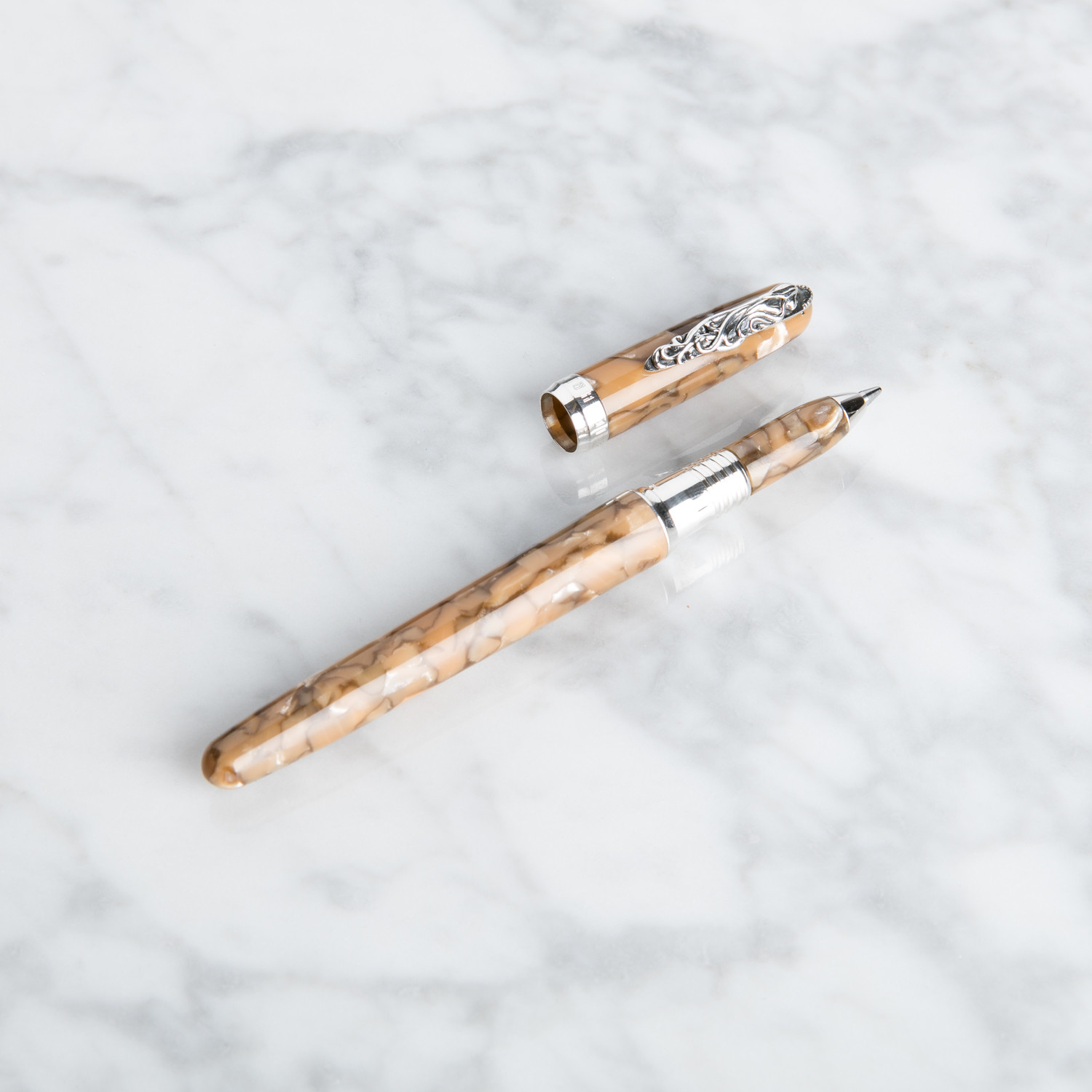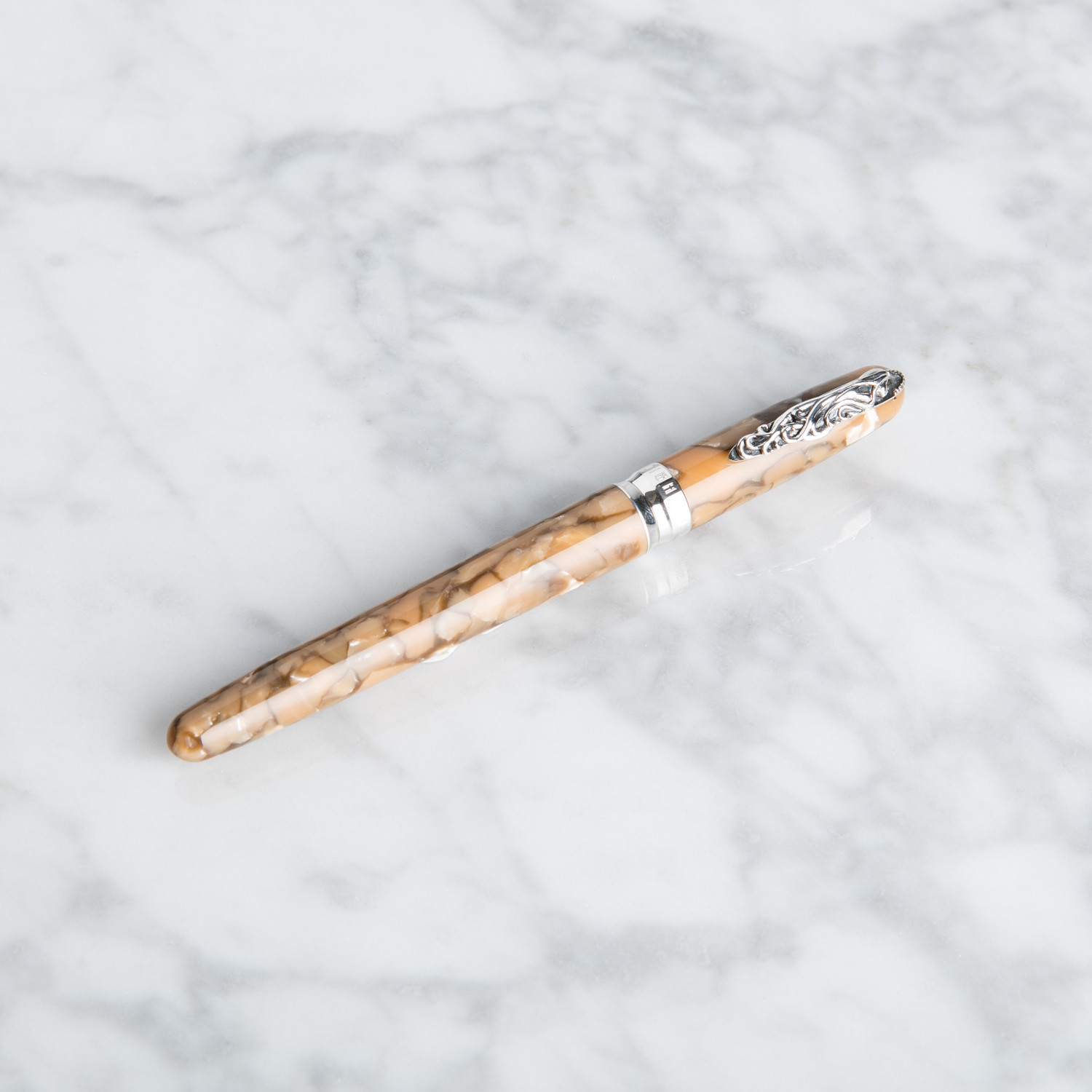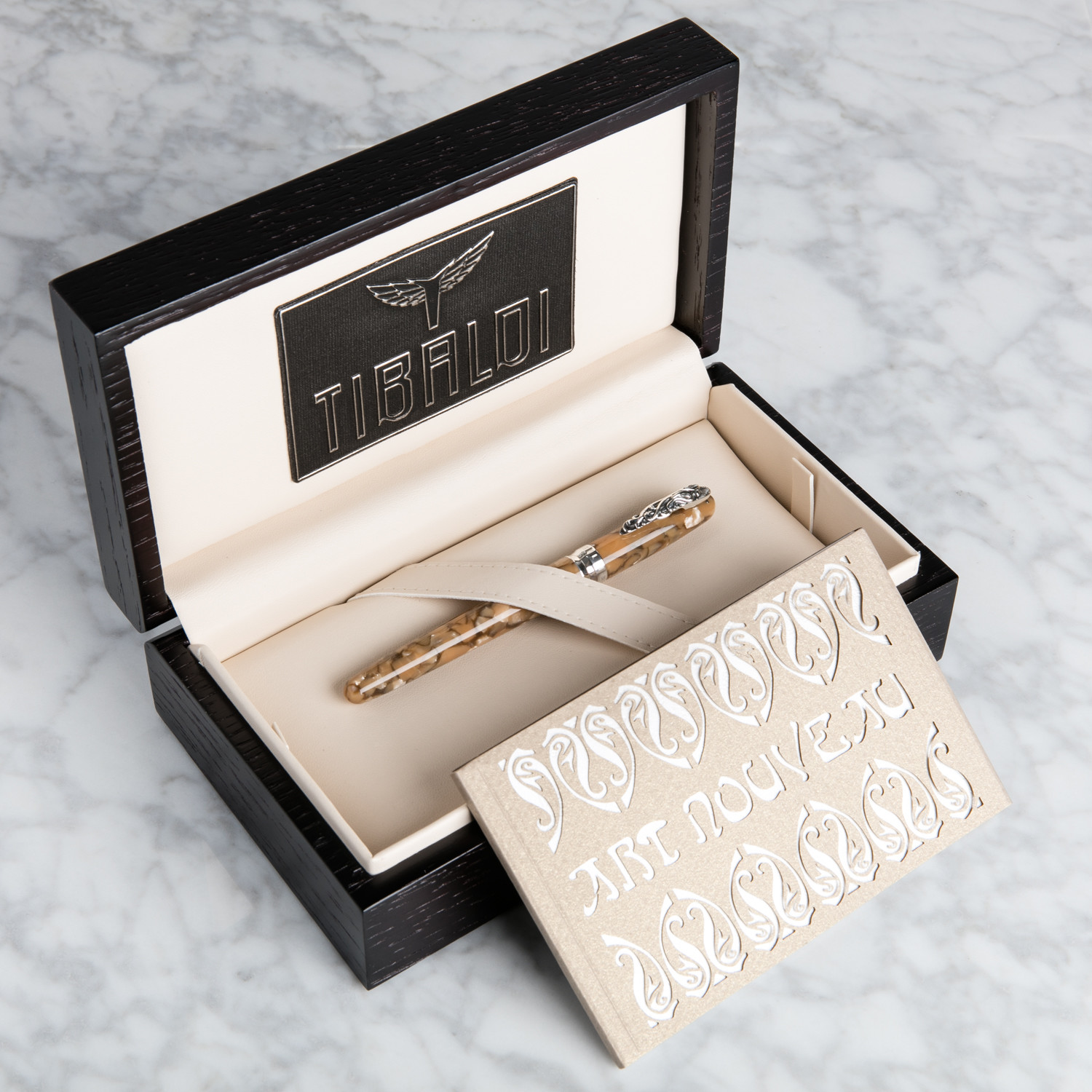 A rich past provides not just continuity but inspiration. For nearly a century, Tibaldi has produced superlative writing instruments, with its early years occurring concurrently with the Art Nouveau period. The movement’s love for forms found in nature, for curves, for elegance, influenced both the visual arts and decorative fixtures and furnishings, as well as the look and feel of manufactured objects of all types and functions. Pens and pencils – portable, personal devices for expressing one’s thoughts – proved to be ideal targets for the Art Nouveau vision. Tibaldi’s past has delivered a classic form perfect for reviving in the Tibaldi Art Nouveau I. Rainbow Nymph Ball Point Pen, a modern version that respects the vintage original.