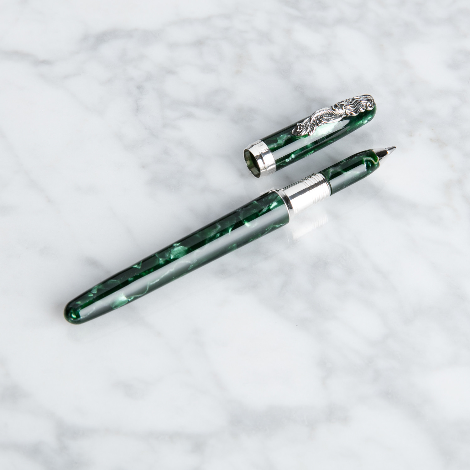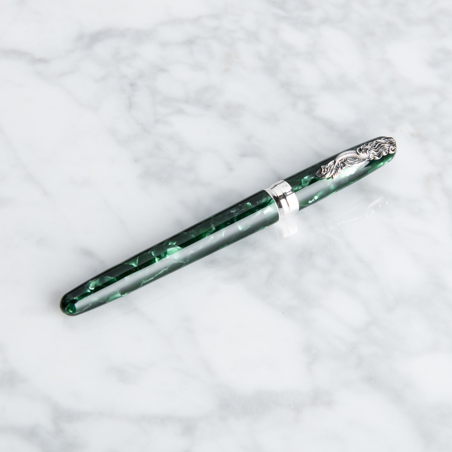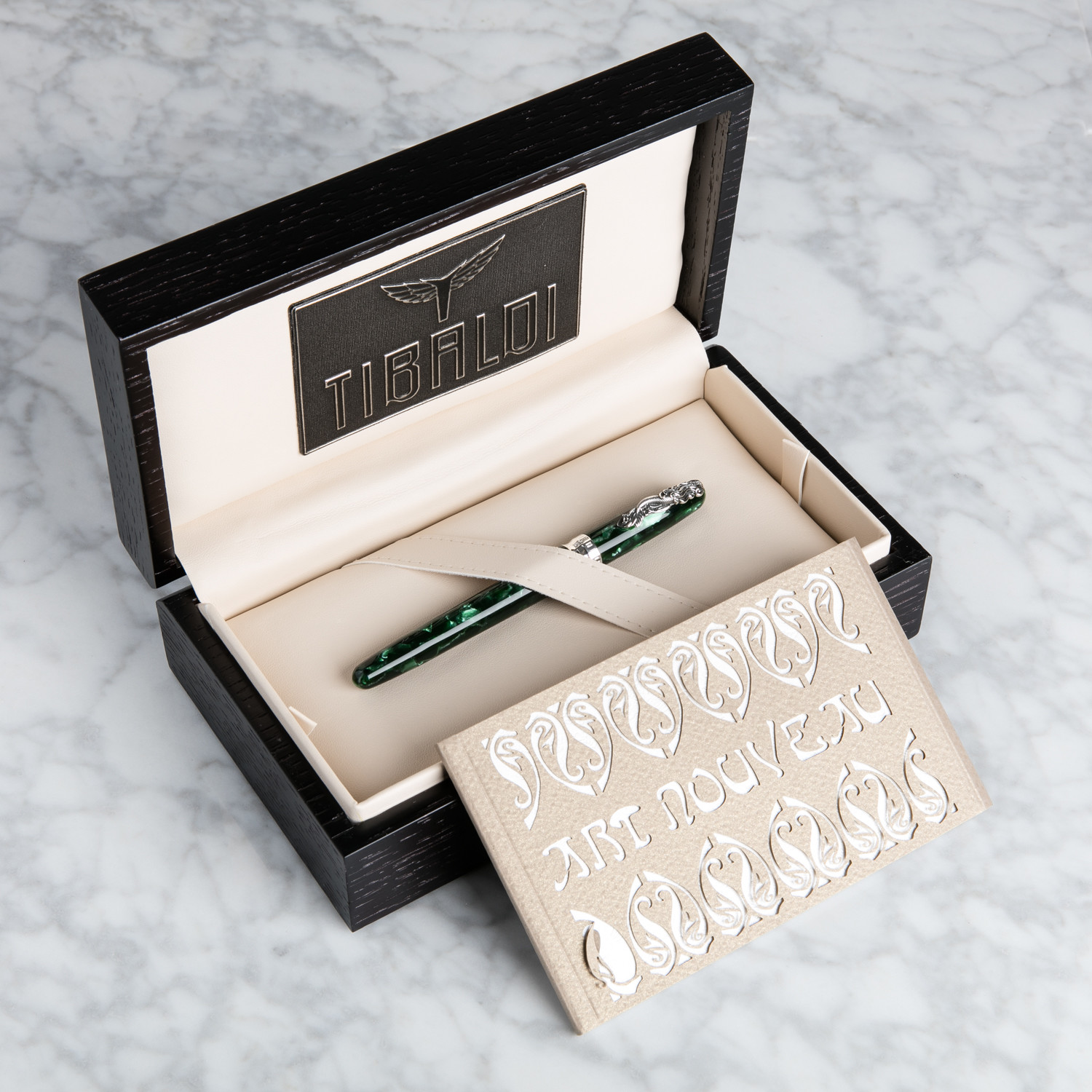 A rich past provides not just continuity but inspiration. For nearly a century, Tibaldi has produced superlative writing instruments, with its early years occurring concurrently with the Art Nouveau period. The movement’s love for forms found in nature, for curves, for elegance, influenced both the visual arts and decorative fixtures and furnishings, as well as the look and feel of manufactured objects of all types and functions. Pens and pencils – portable, personal devices for expressing one’s thoughts – proved to be ideal targets for the Art Nouveau vision. Tibaldi’s past has delivered a classic form perfect for reviving in the Tibaldi Art Nouveau Malachite Mermaid Ball Point Pen, a modern version that respects the vintage original.