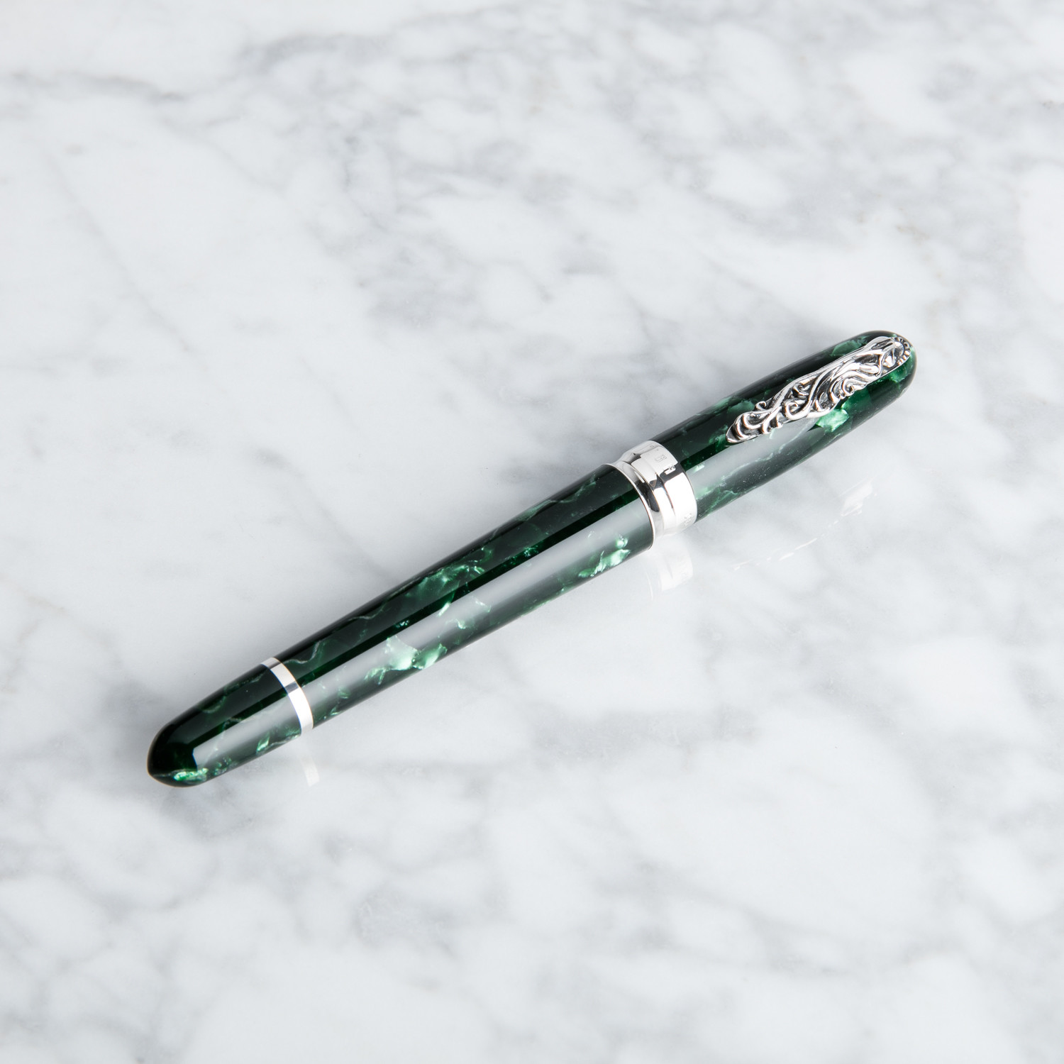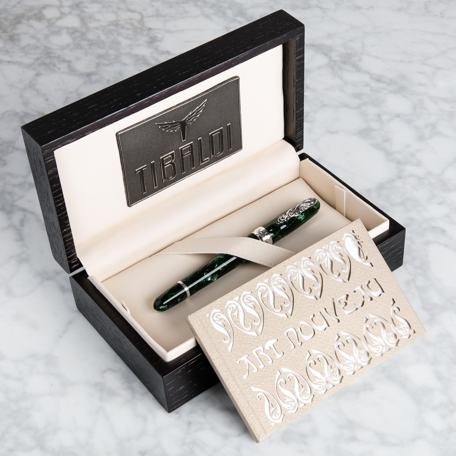 A rich past provides not just continuity but inspiration. For nearly a century, Tibaldi has produced superlative writing instruments, with its early years occurring concurrently with the Art Nouveau period. The movement’s love for forms found in nature, for curves, for elegance, influenced both the visual arts and decorative fixtures and furnishings, as well as the look and feel of manufactured objects of all types and functions. Pens and pencils – portable, personal devices for expressing one’s thoughts – proved to be ideal targets for the Art Nouveau vision. Tibaldi’s past has delivered a classic form perfect for reviving in the Tibaldi Art Nouveau Malachite Nymph Roller Ball, a modern version that respects the vintage original.