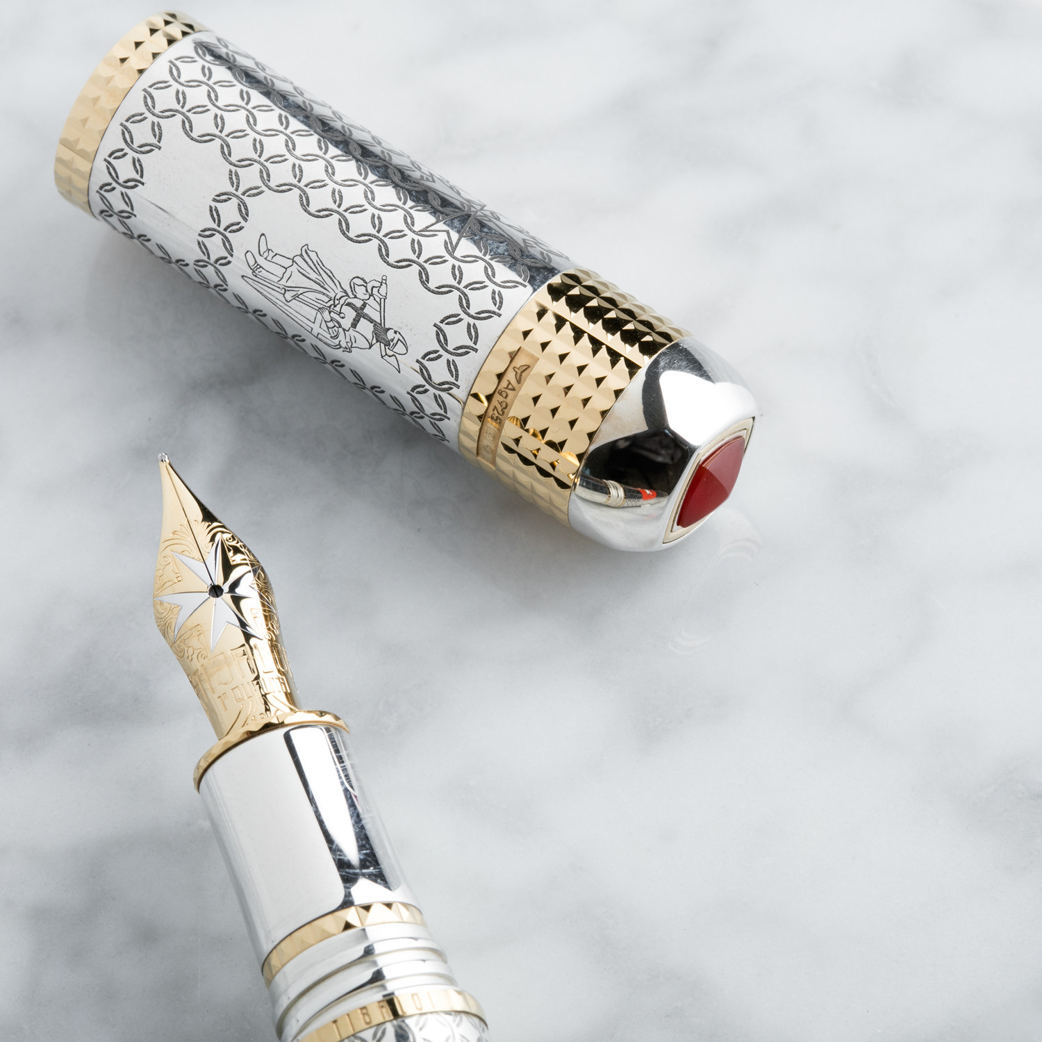 The Tibaldi Order of Malta Fountain Pen celebrating the chivalry world following the Sacer Militaris Ordo Constantiniani Sancti Georgii. It is a numbered limited edition pen, one of 530 writing instruments in sterling silver and 18ct gold.