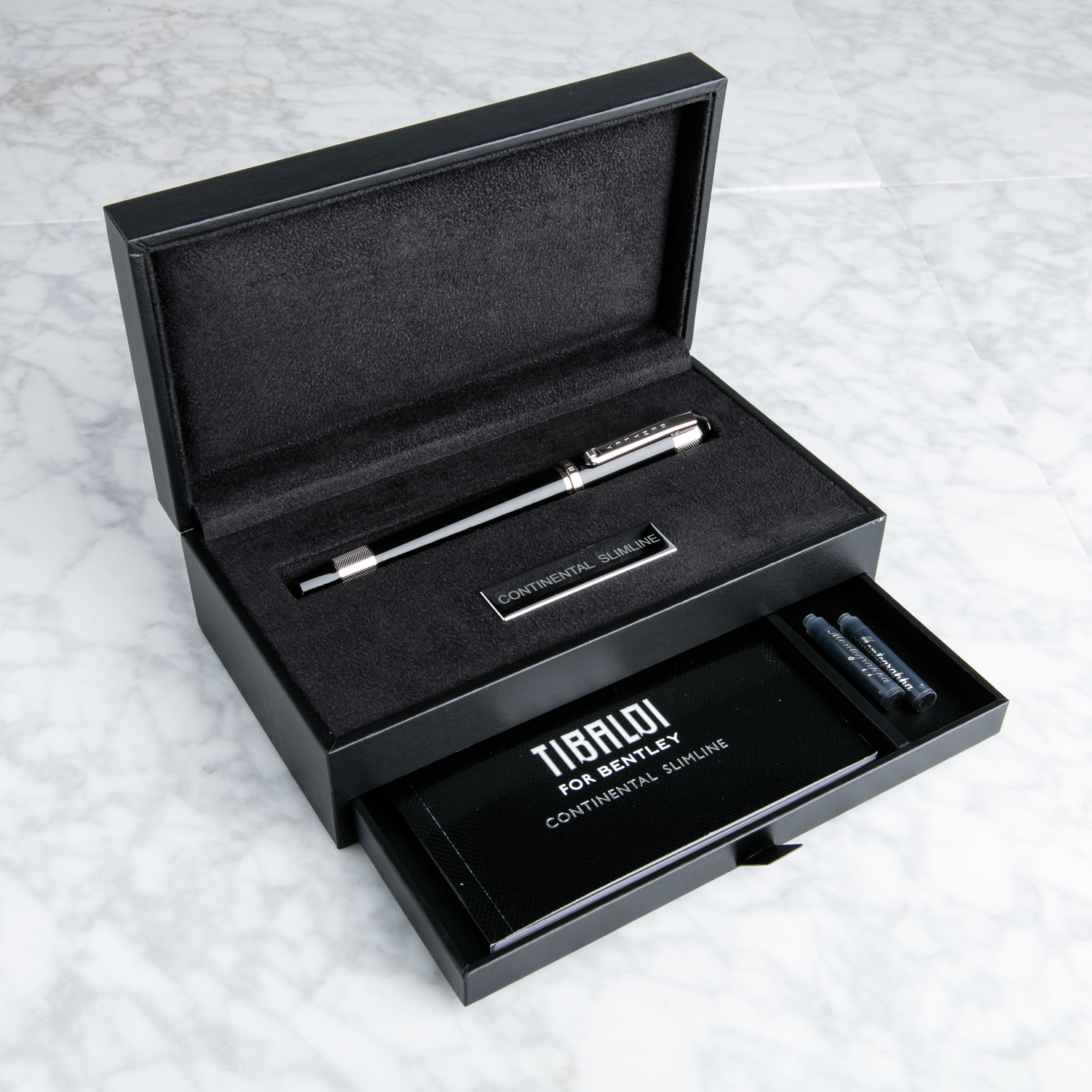 The limited edition Tibaldi Slimline Beluga Fountain Pen, a compact and lighter alternative to more its more imposing sibling, is crafted exclusively for Bentley Motors. It has the appeal of the original writing instrument in a new range that downsizes the collection for smaller hands and thus suitable for both men and women.