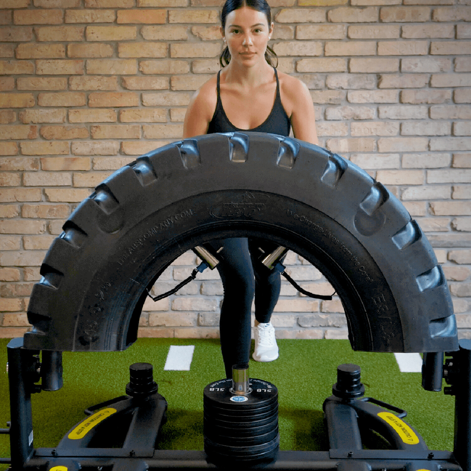 The patented TireFlip 180® is an innovative functional training system that gives you all the benefits of tire training in a safe, space-saving design. Flipping is just the beginning—perform hundreds of exercises including strength, power, and agility in only 4x5 feet of space! Two functional attachment brackets allow for battle rope and resistance band training too. You can keep your workout area clear and organized with integrated weight storage post for the included 5-lb and 10-lb weight plates. The addition of handles and wheels make it convenient to move and store out of the way when you're done.
