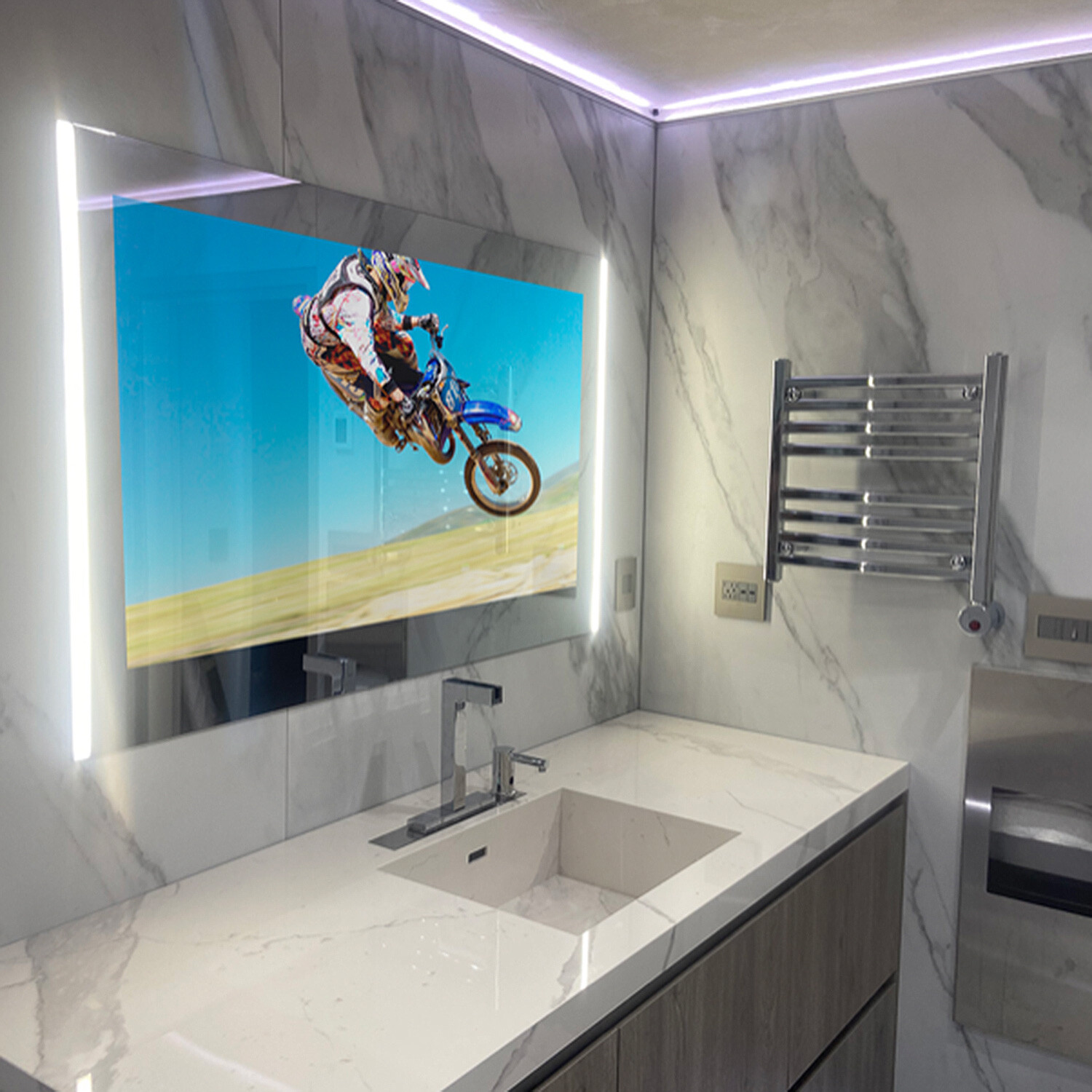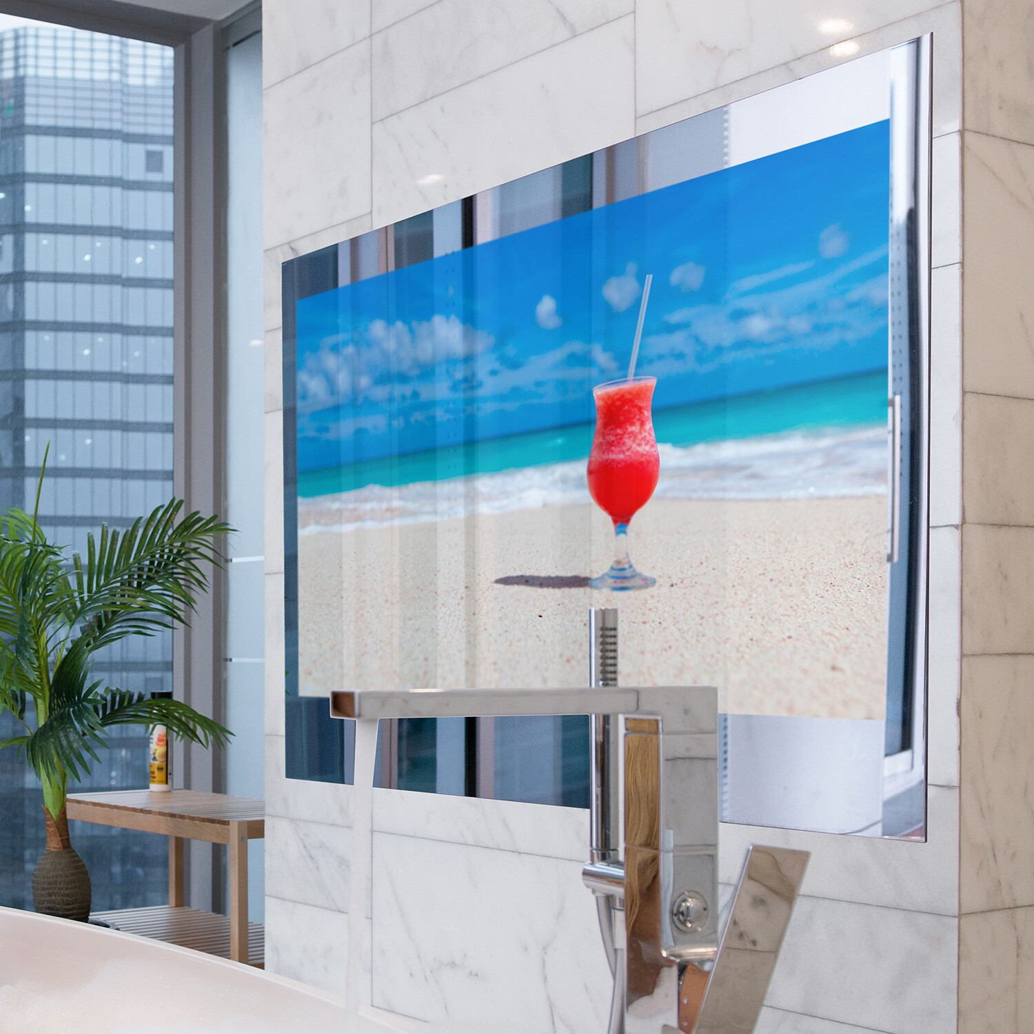 Introducing the high-resolution Magic Mirror TV. When it's off, it looks just like any ordinary mirror you can use to get ready in the morning or double check your appearance before heading out the door. Switch it on, and it transforms into a bright LED LCD screen with a high definition 4K display. The addition of integrated vibration speakers ensures you hear every detail with excellent clarity. Place it in the bathroom, kitchen, living room, on the lanai, or outside by the pool for a futuristic home accent that is sure to surprise your guests.