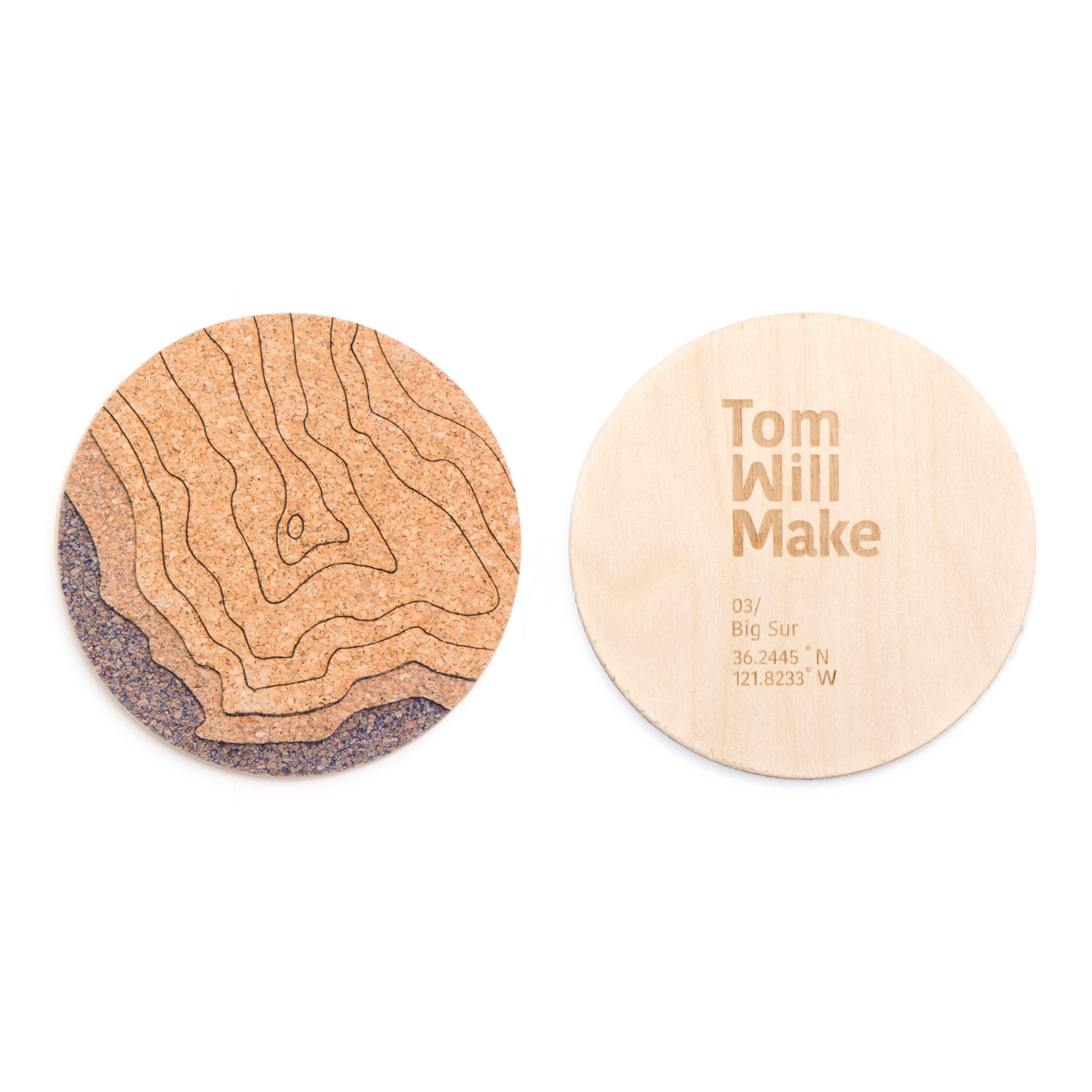 Topo Coasters represent the real topography of your favorite places. The realistic elevation changes are illustrated with multiple layers of cork, and the back of each coaster is a layer of veneer engraved with the geographic coordinates of the location depicted by the topography on the front.
