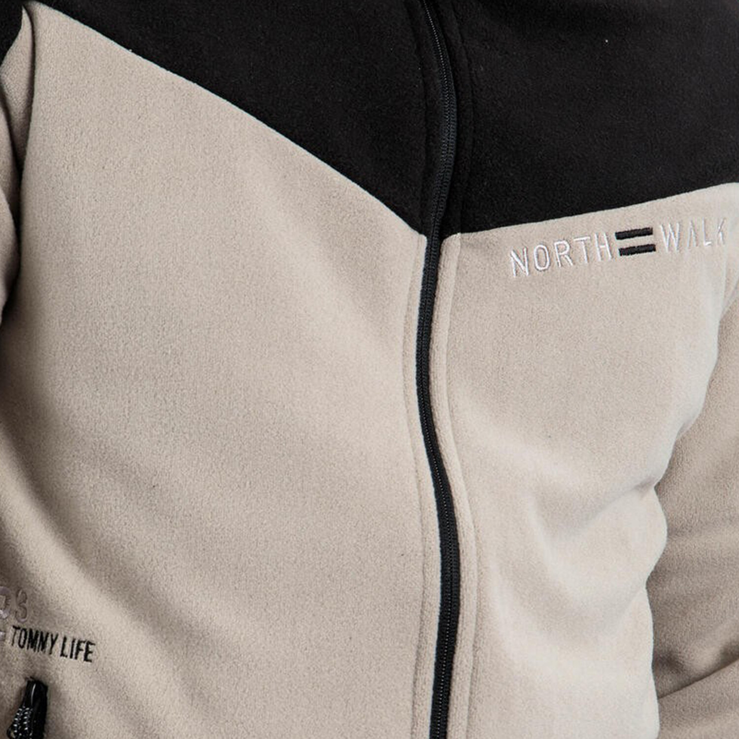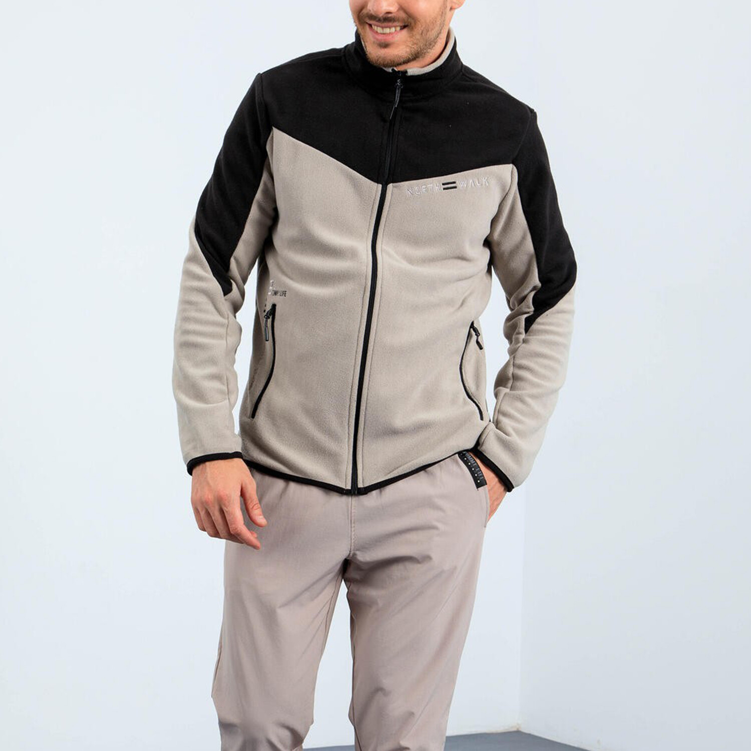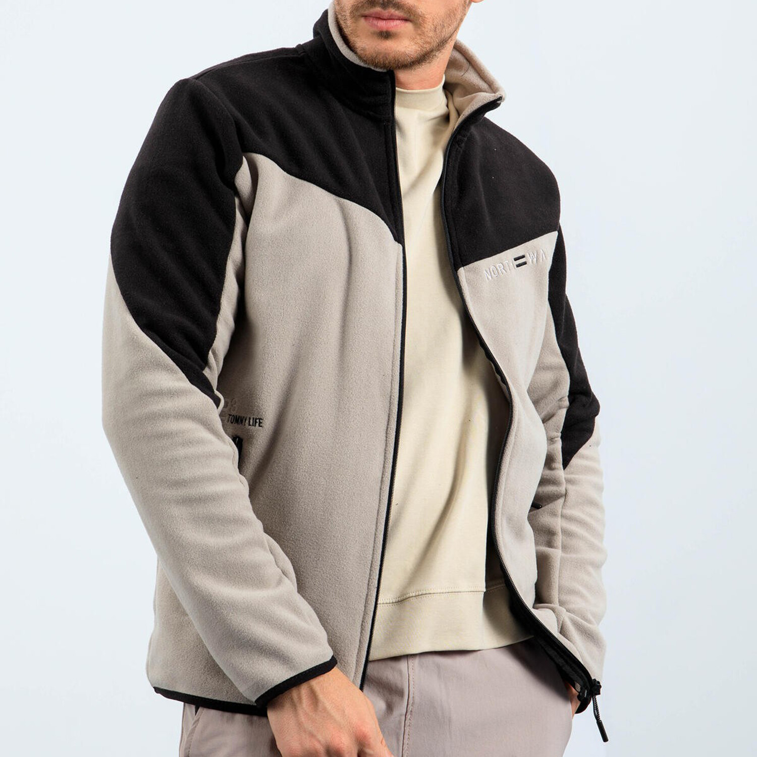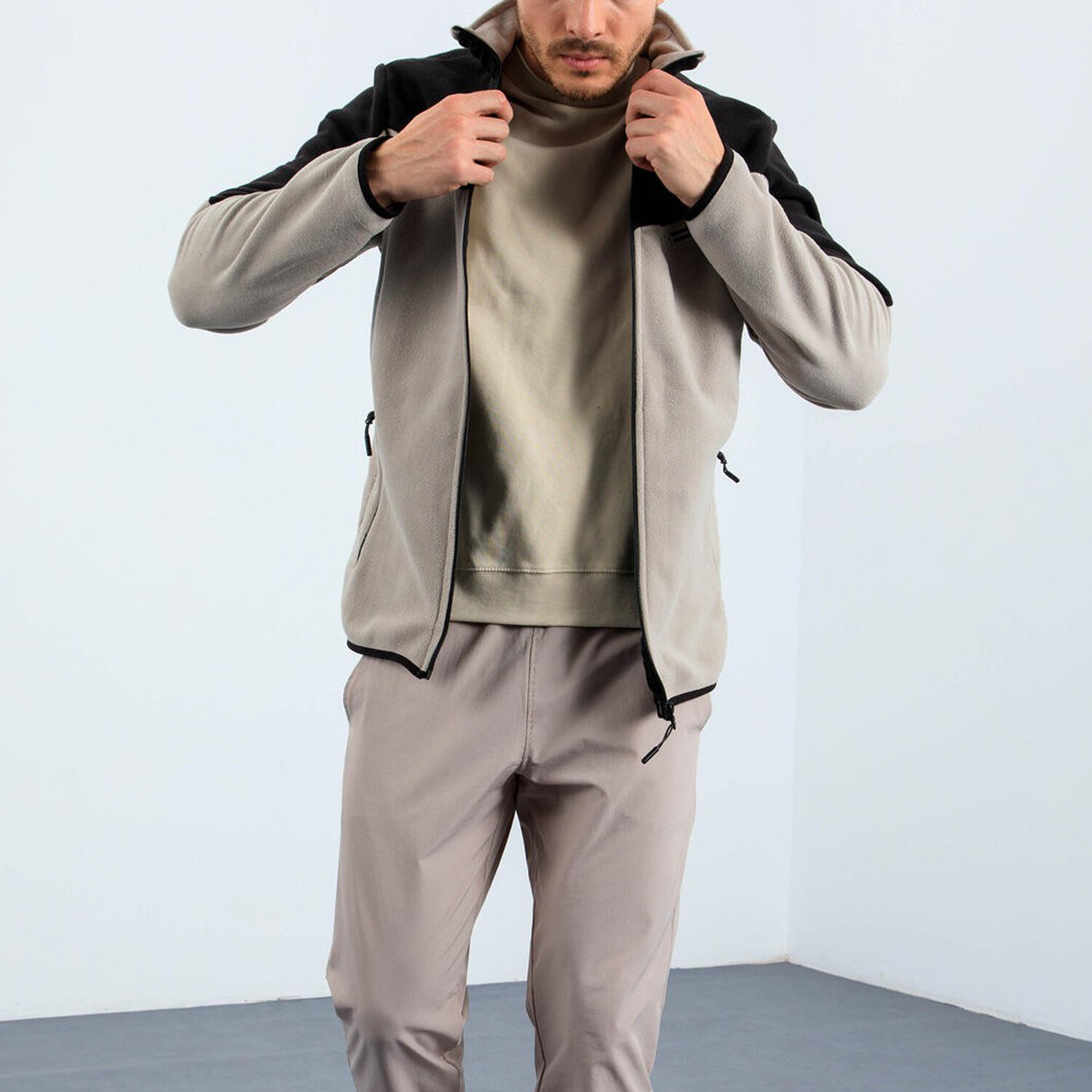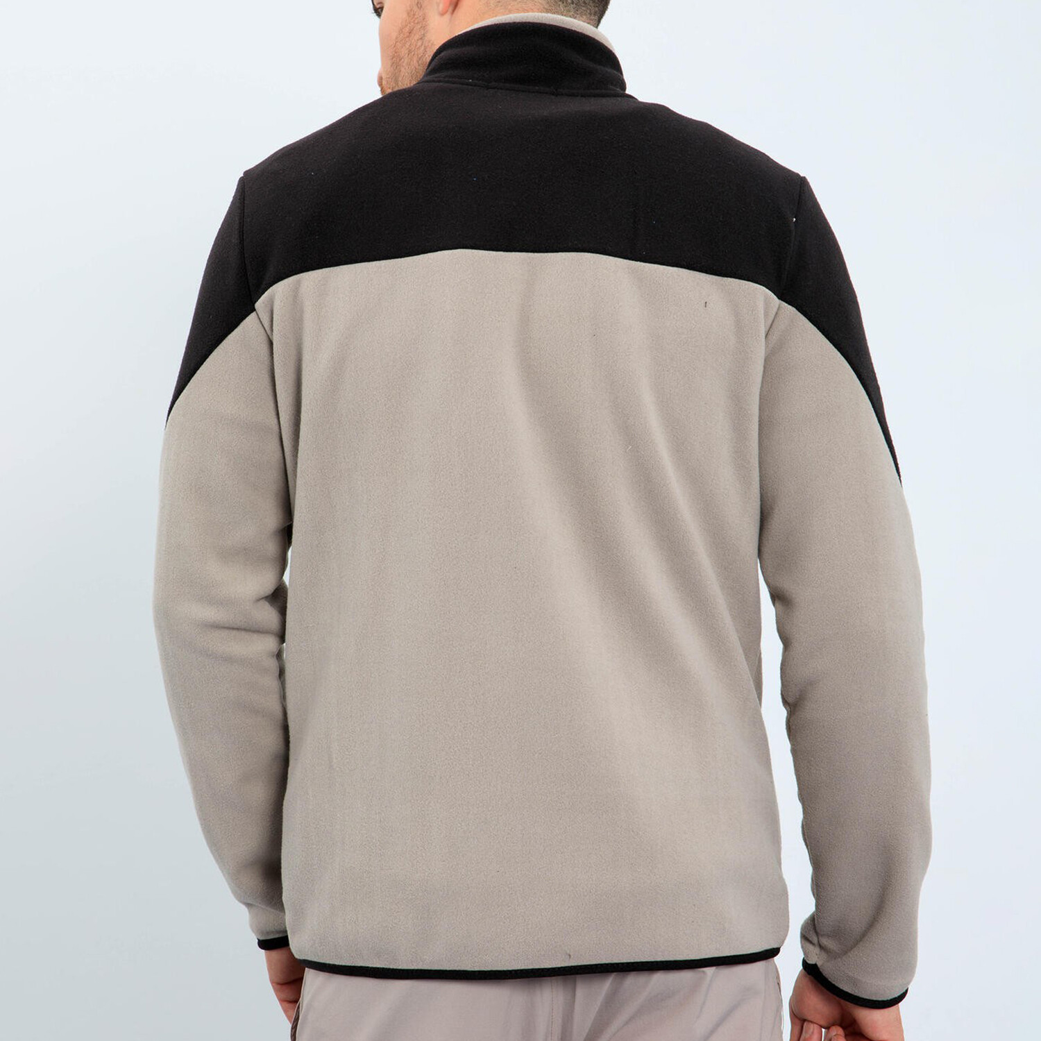 Men's Zip-Up Collared Polar Fleece Two-Tone Jacket // Dark Beige + Black