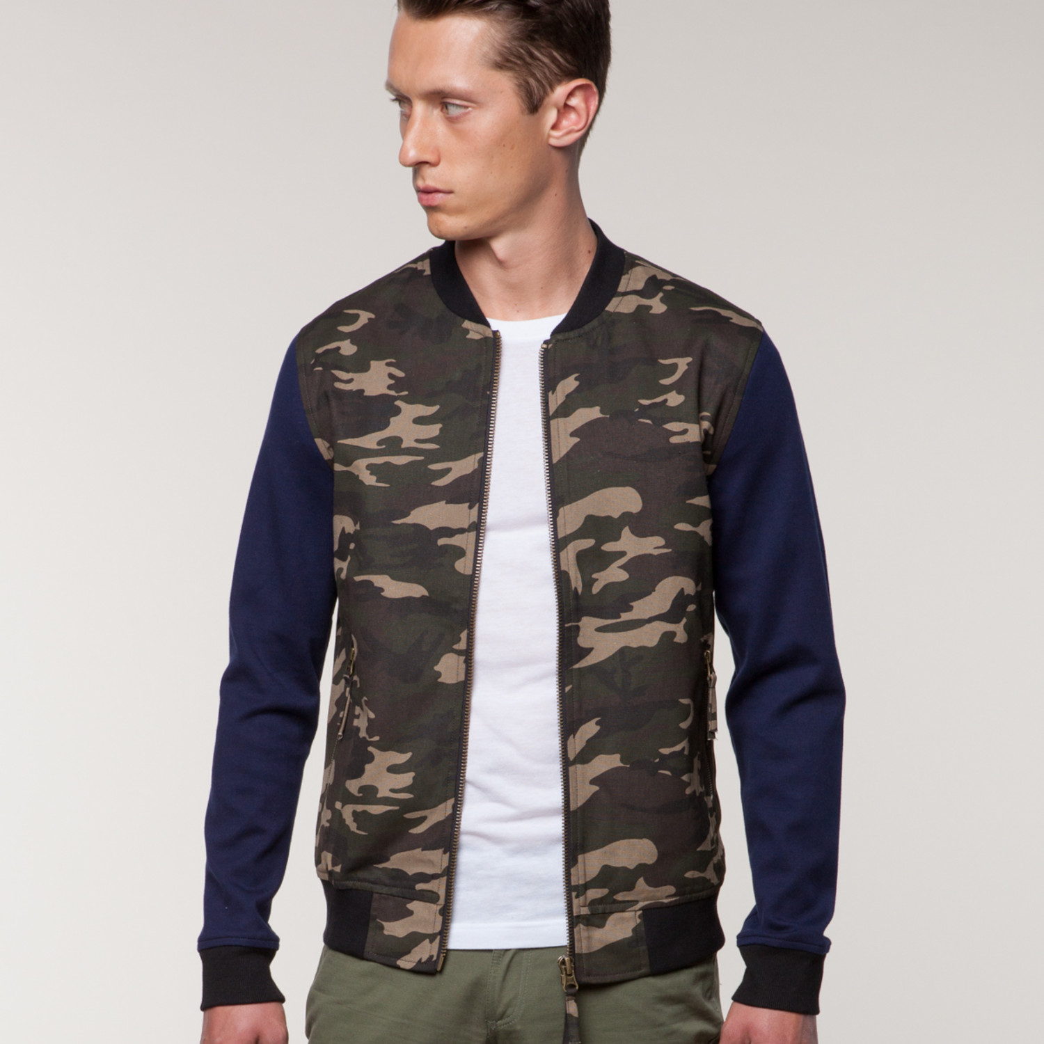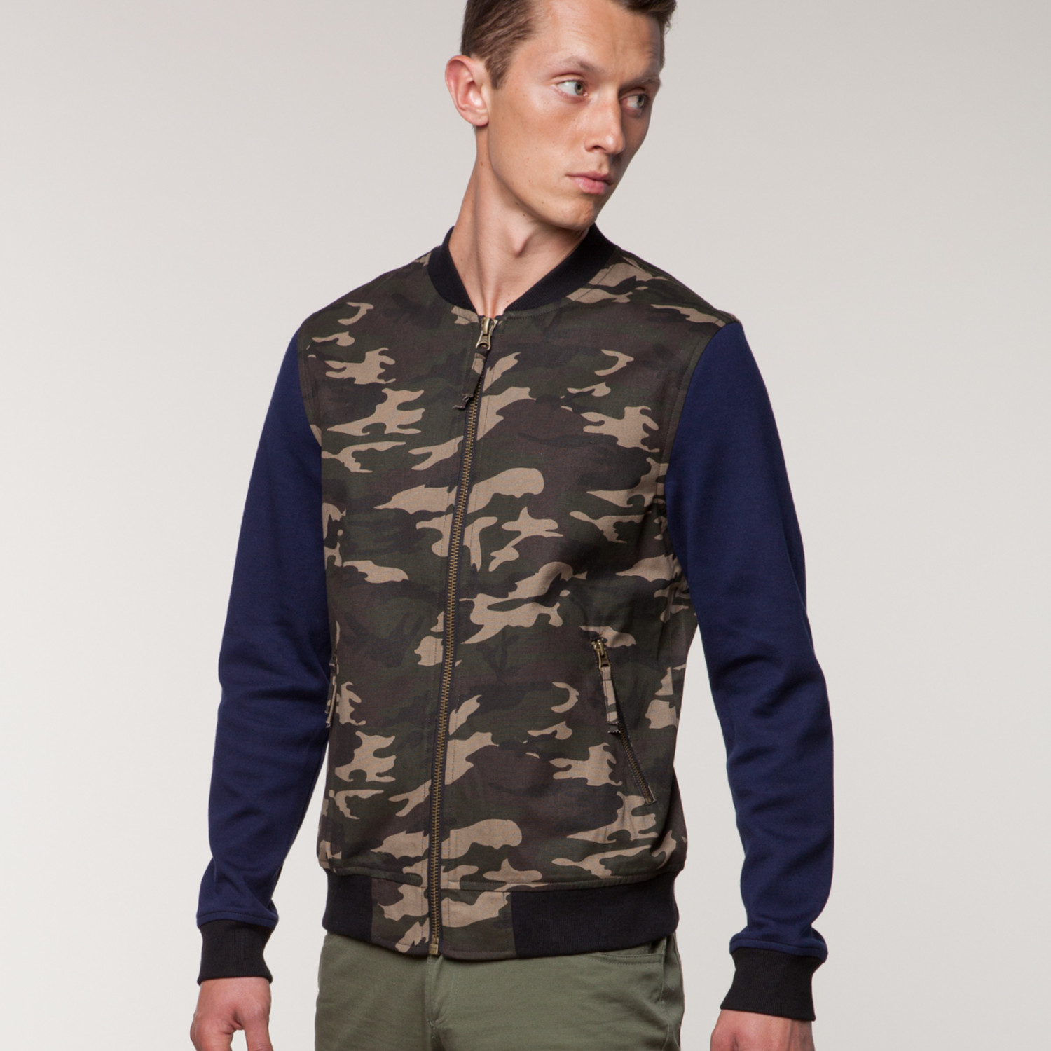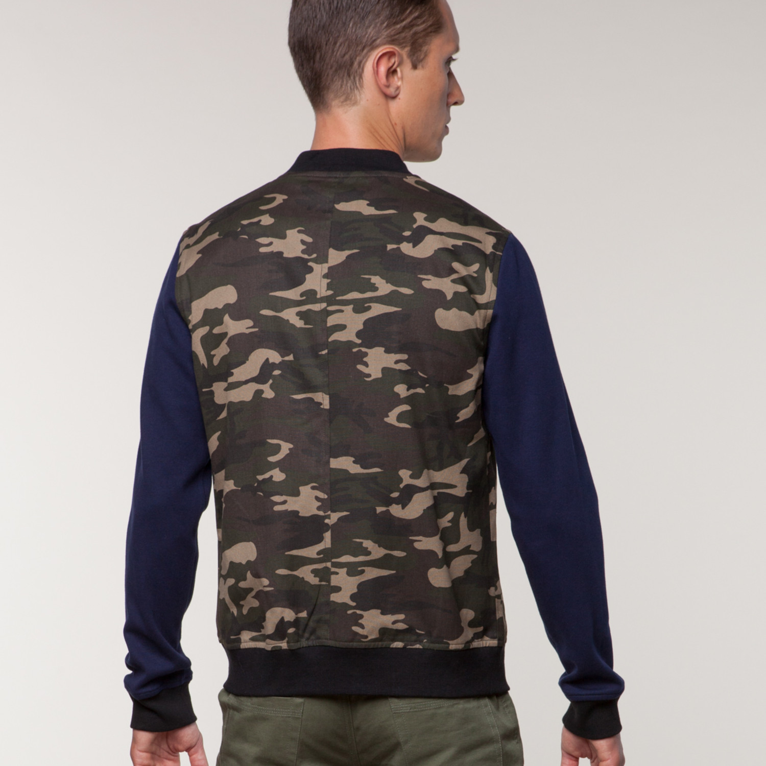 This vintage-inspired double knit zip baseball jacket is the ideal piece for hanging out around the city in any weather. It features a ribbed waistband, collar, and cuffs, as well as army print with contrasting navy sleeves for a retro-modern look.