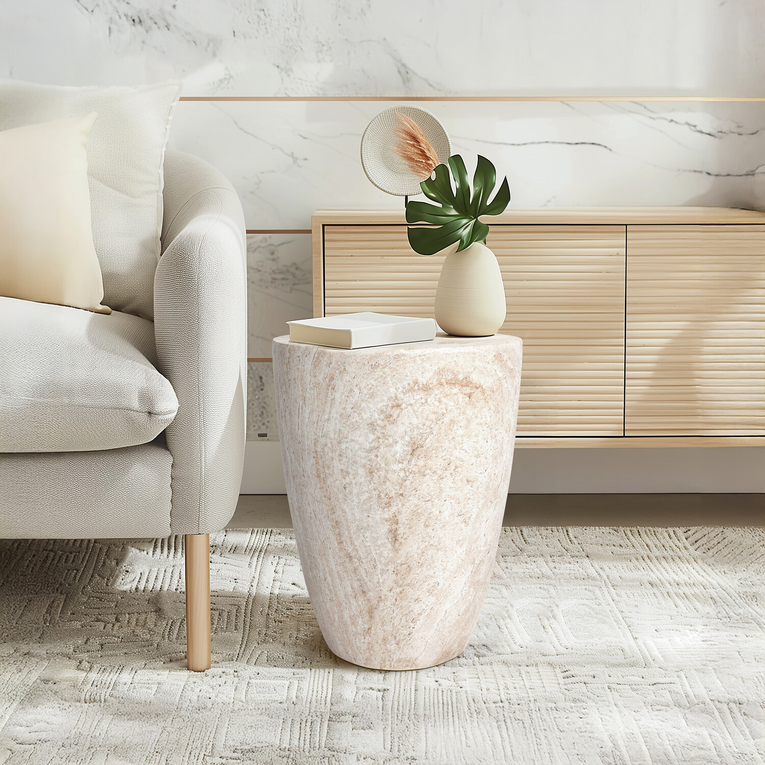 Tapered Travertine Stone Finish Italian Design MgO Side Accent Table