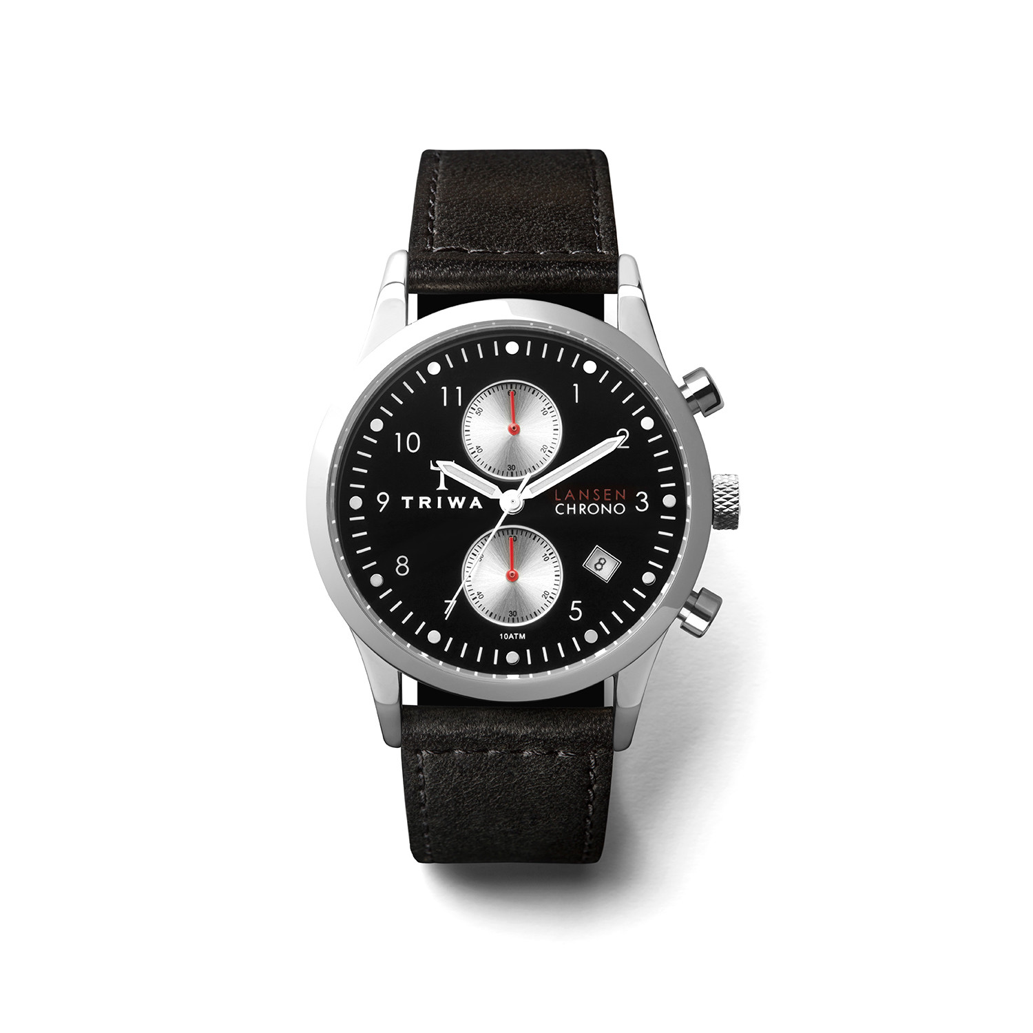 With one eye on fashion and the other on design, the Raven Lansen Chrono is a triumph of deliciously Swedish design values. The black dial is surrounded by a stainless steel silver case and centered by two stainless steel mini-dials at 3- and 9 o'clock. An organic vegetable-tanned leather strap completes the look with more black, offering comprehensive visual cohesion.