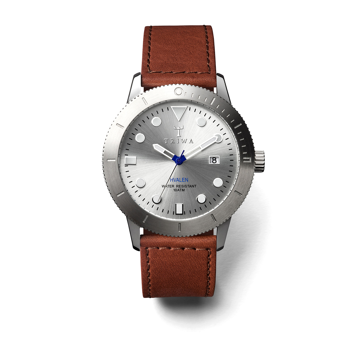 Stirling Hvalen is a contemporary designed diving watch with the Triwa characteristic combination of classic, sharply defined silhouettes with a contemporary twist. It has a unidirectional rotational bezel in stainless steel with debossed indicators and a silver sunray dial with oversized luminous hour indicator.