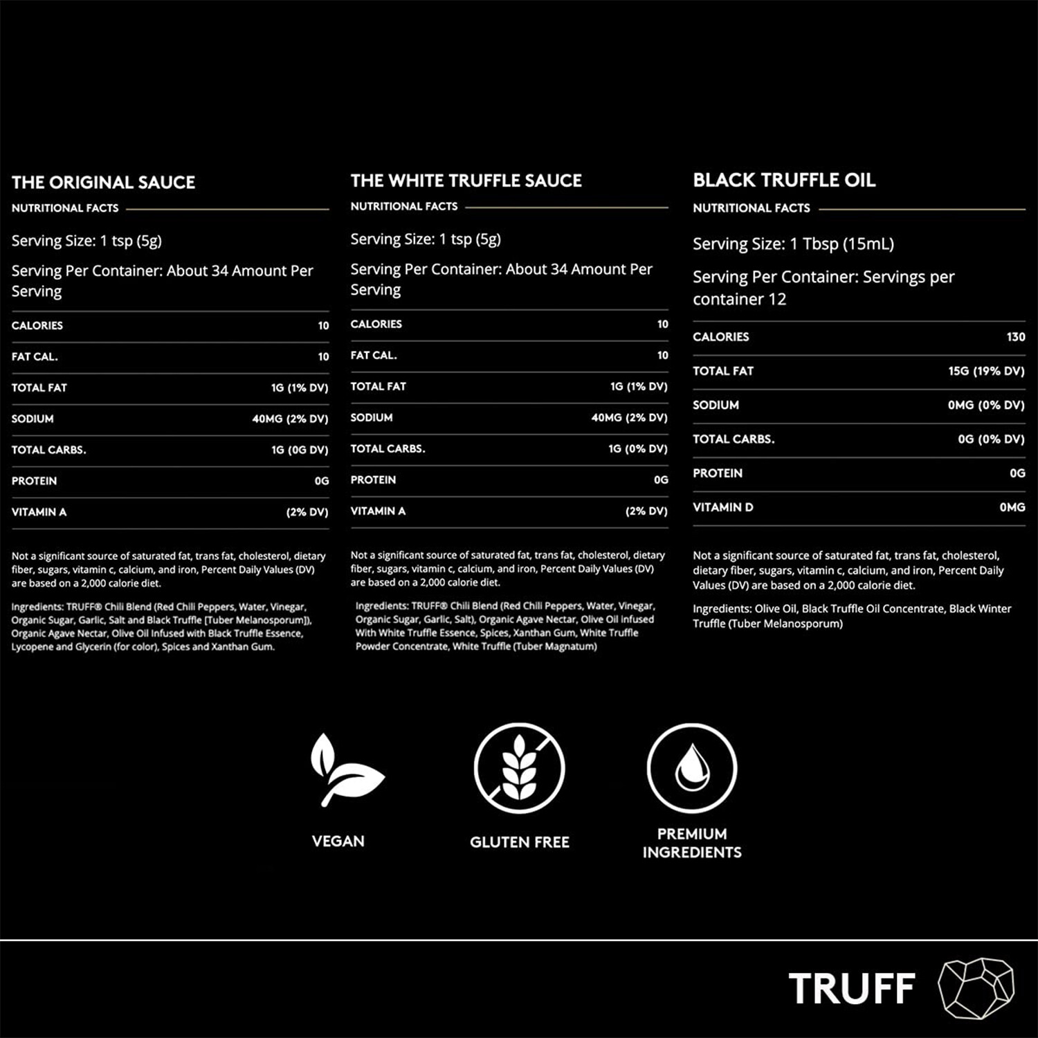 — Original Black Truffle Sauce: TRUFF® Chili Blend (Red Chili Peppers, Vinegar, Organic Sugar, Garlic, Salt and Black Truffle), Organic Agave Nectar, Olive Oil infused with Black Truffle Essence, Lycopene and Glycerin (for color), Organic Cumin and Xanthan Gum