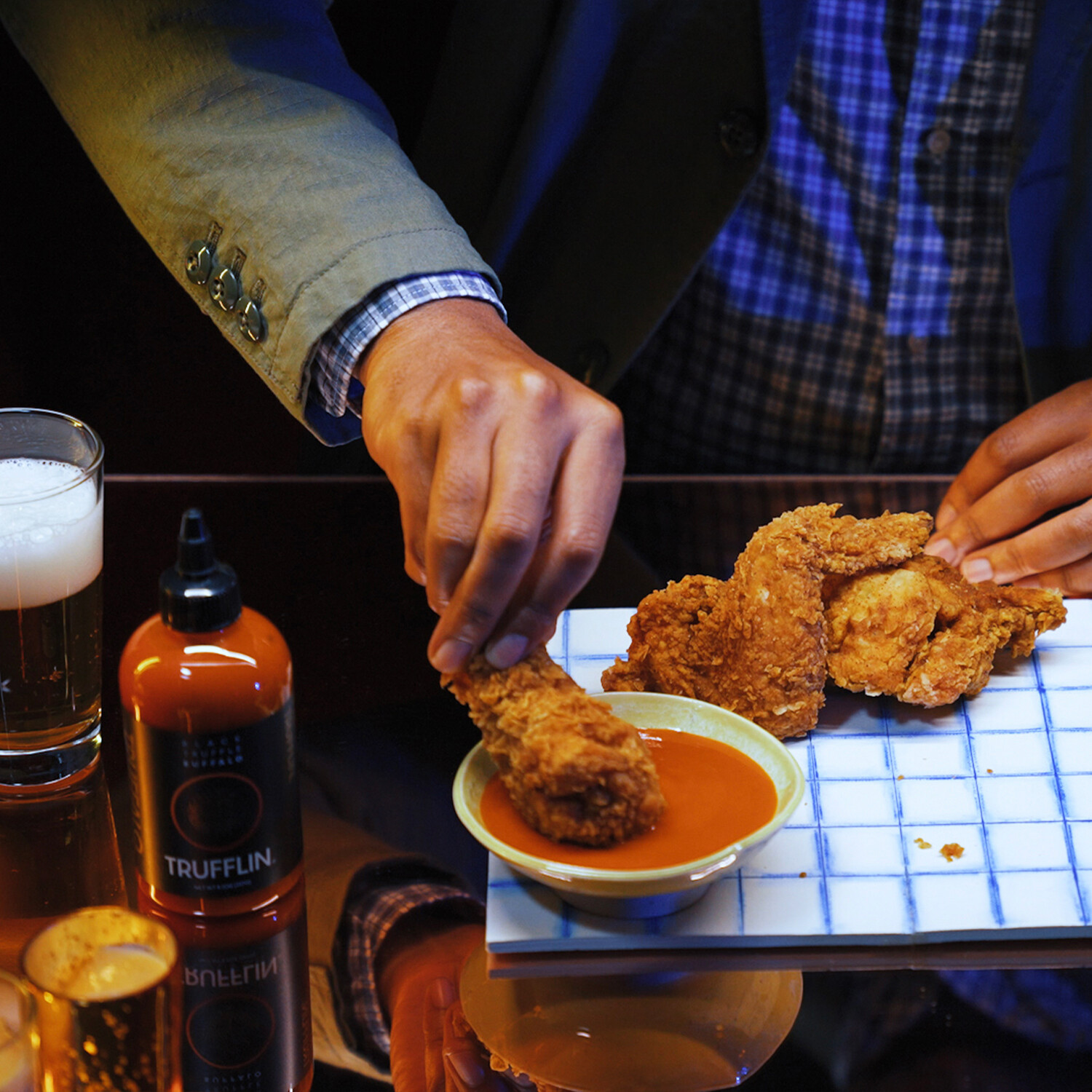 Trufflin Gourmet Truffalo Sauce blends cayenne and chipotle peppers from freshly harvested chilis. Liven up your next batch of veggies or buffalo wings with the umami you didn't know you were missing. This buffalo sauce is produced in small batches with all natural ingredients like real black truffle, raw organic honey, roasted garlic, peppers, and Trufflin's signature truffle oil. It is made with naturally fermented peppers and contains no preservatives.