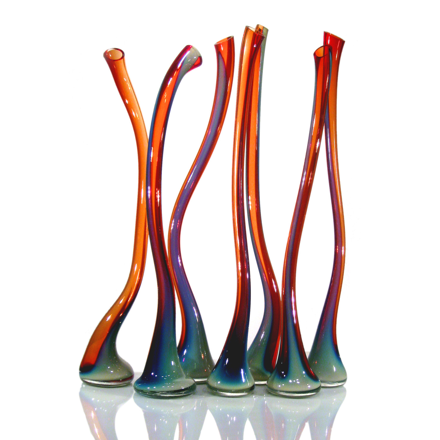 Like windblown plains, this grouping of exquisitely designed, cherry and turquoise colored glassware will bring nature and serenity to any living space. Curvaceous and playful, these eye-catching pieces will also be sure to add more color and energy to your day. Tsunami Glassworks incorporates their signature hand-blown techniques to form these shapes, and as usual play with scale through multiples. Set them in a corner or along a window’s edge and you’ll be sure to impress anybody who sets their eyes on them.