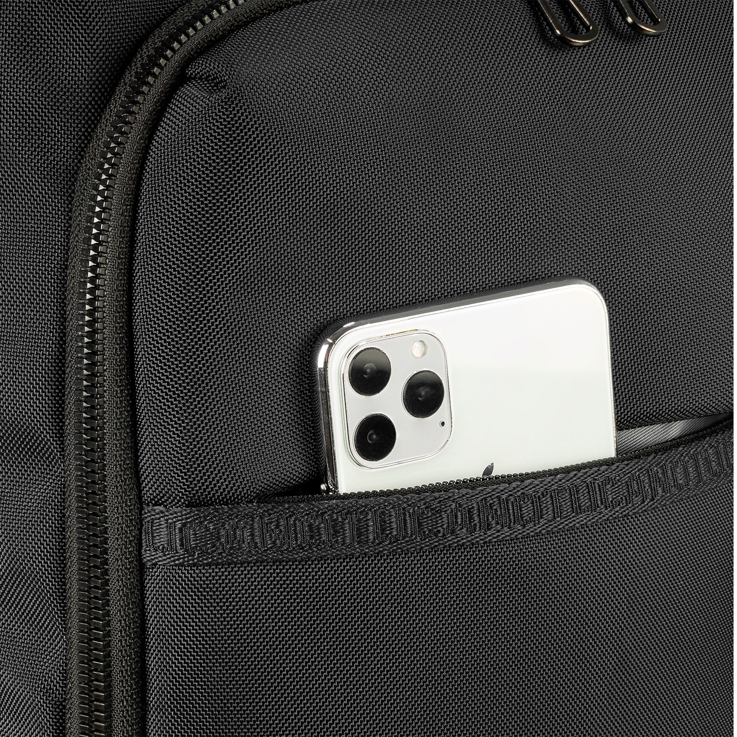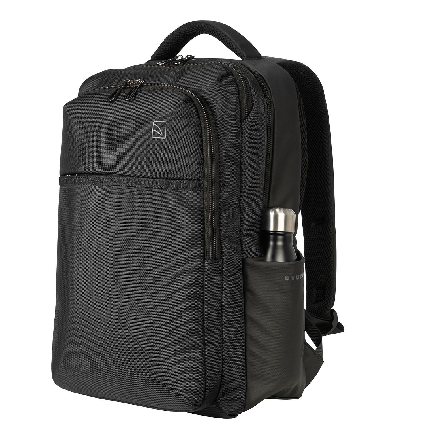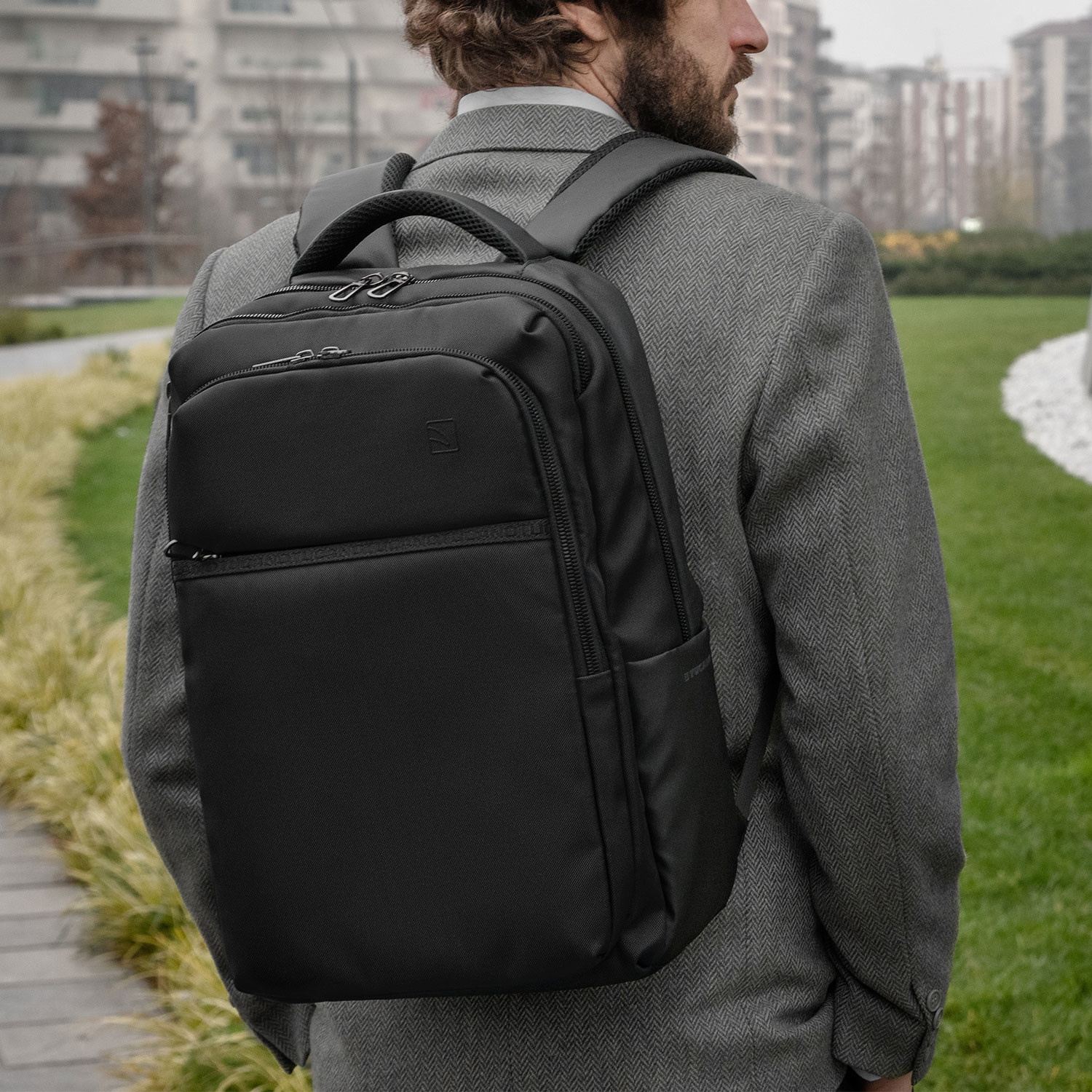 Made of high-density fabric, Marte is very well organized both inside and out. The extra-roomy interior compartment is equipped with two padded pockets for tablets and laptops up to 15.6". The front side provides different-sized spaces with zipper closures for added organization while two side pockets offer the perfect place to store a water bottle and an umbrella. The ergonomically designed back features padded shoulder straps, a trolley strap, and a security pocket. A removable rain cover, hidden in the bottom allows you to protect your backpack if the weather starts to turn.