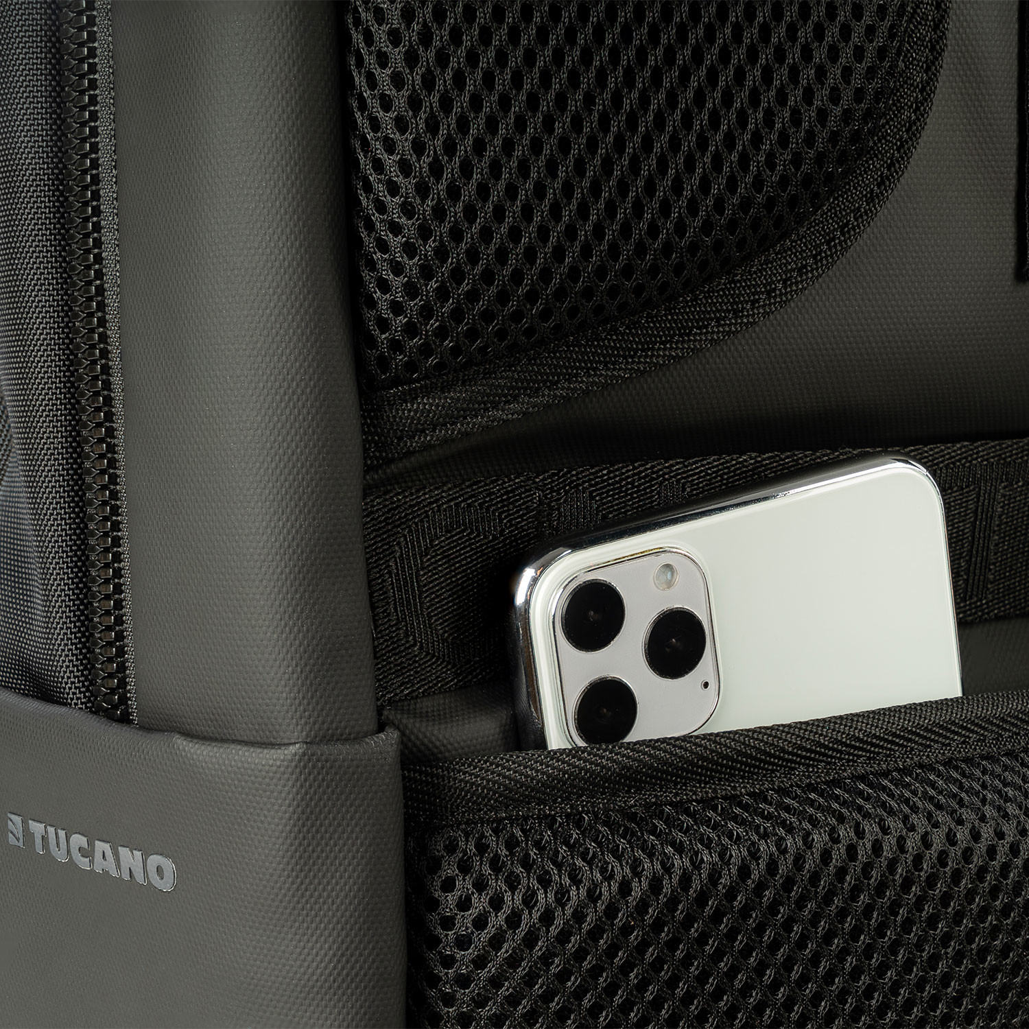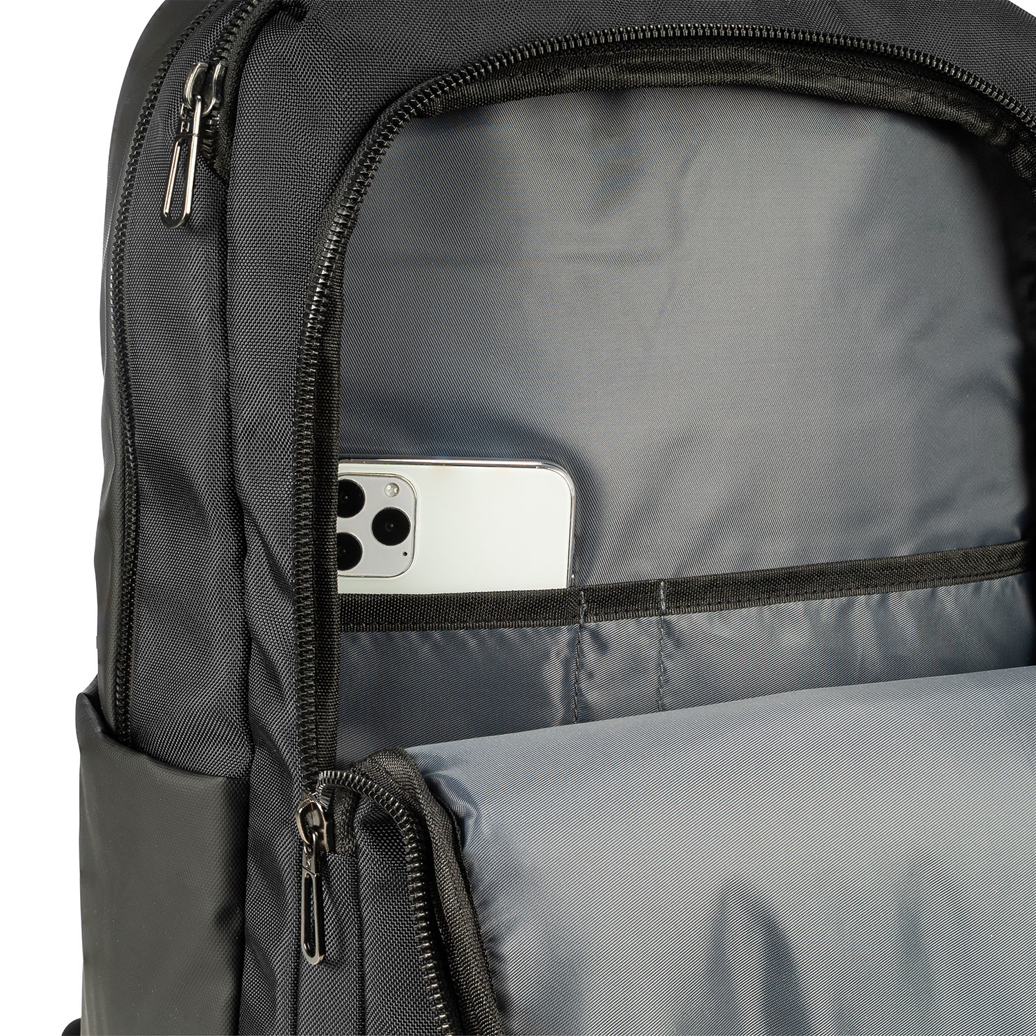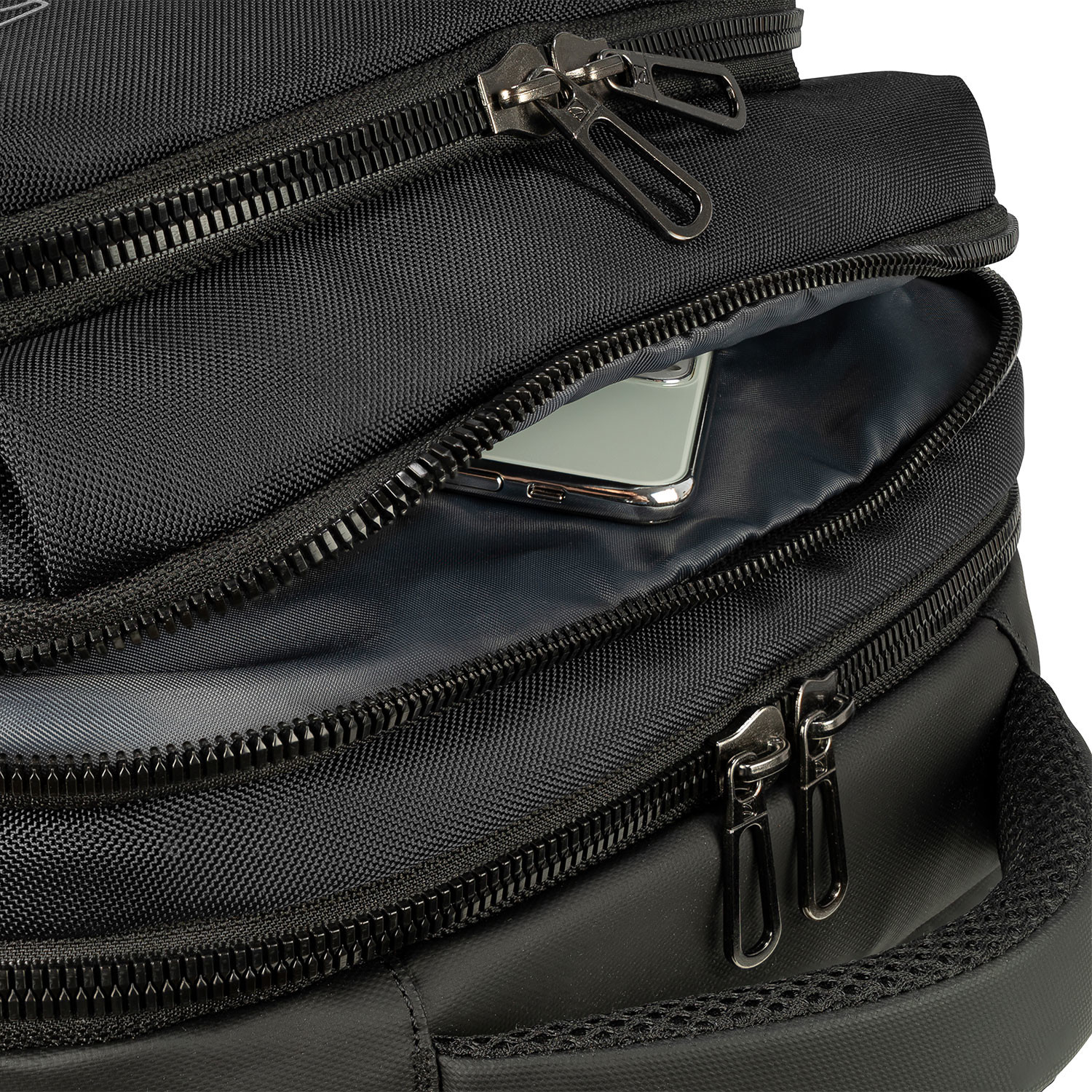 Made of high-density fabric, Marte is very well organized both inside and out. The extra-roomy interior compartment is equipped with two padded pockets for tablets and laptops up to 15.6". The front side provides different-sized spaces with zipper closures for added organization while two side pockets offer the perfect place to store a water bottle and an umbrella. The ergonomically designed back features padded shoulder straps, a trolley strap, and a security pocket. A removable rain cover, hidden in the bottom allows you to protect your backpack if the weather starts to turn.