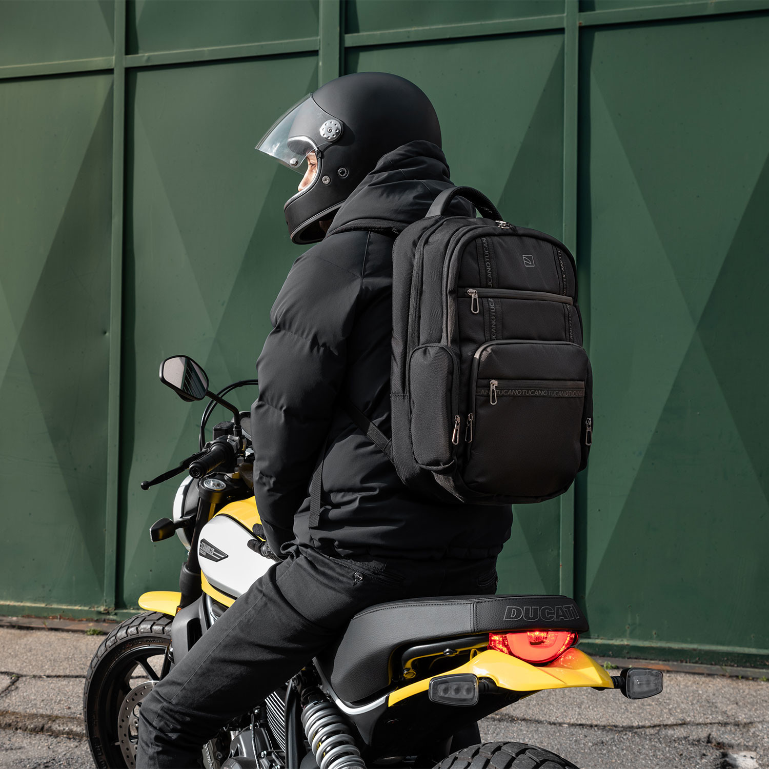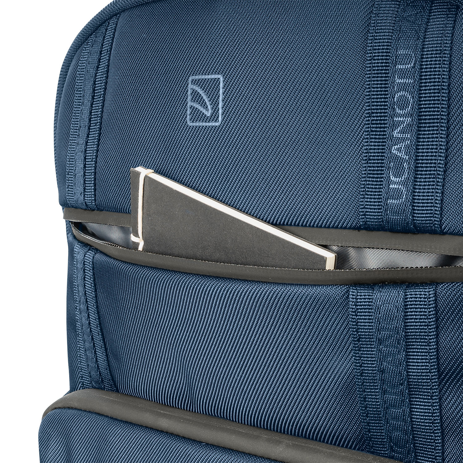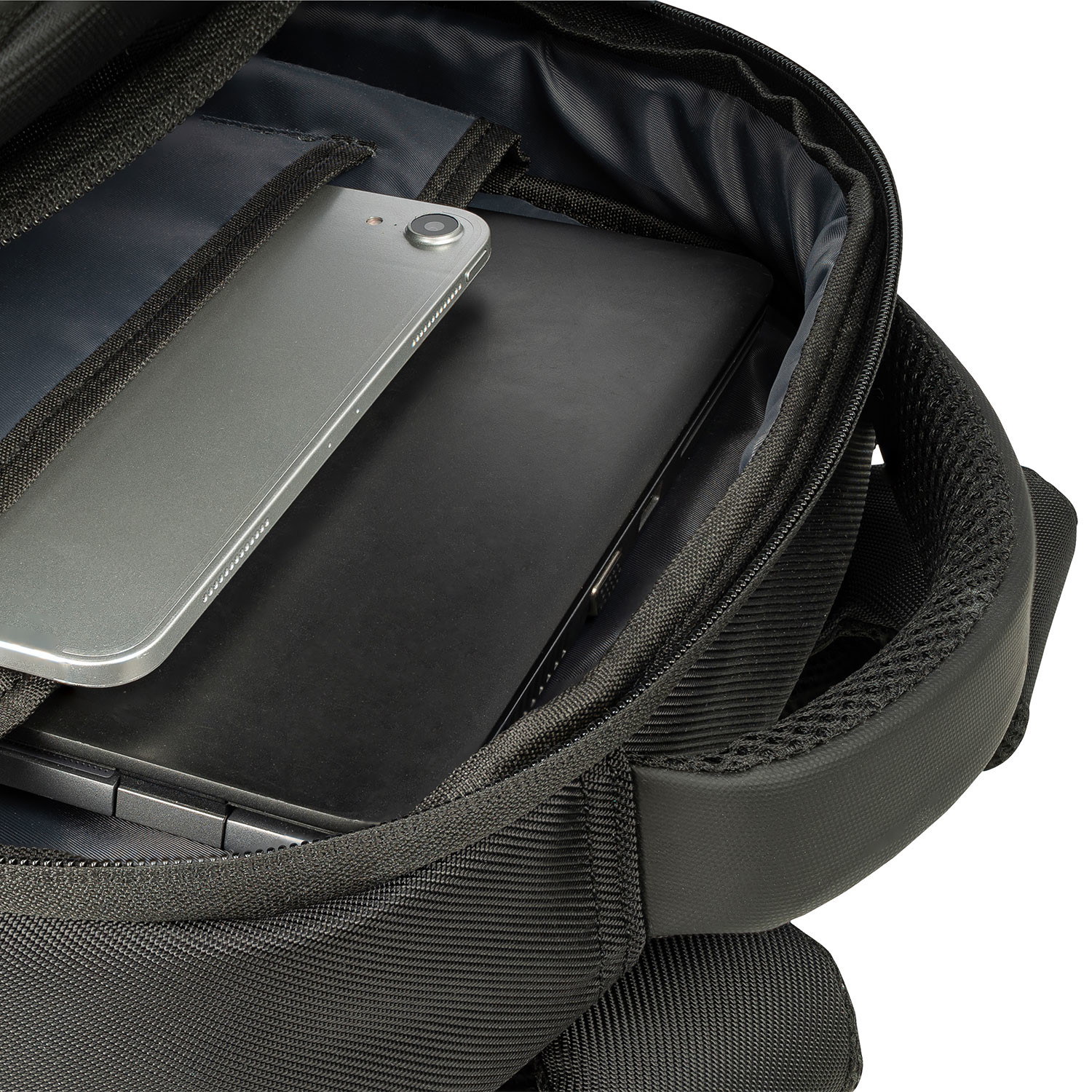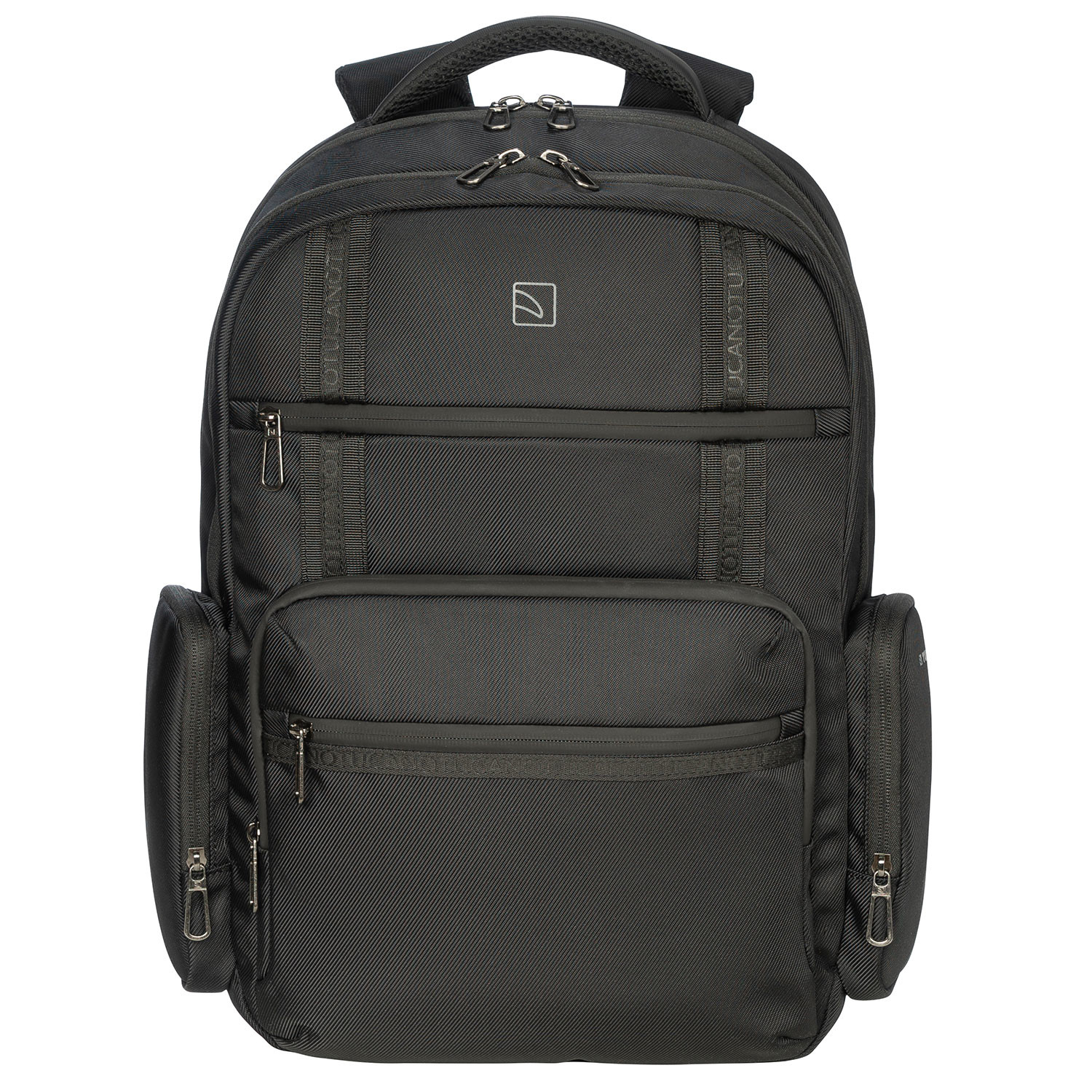 Sole is equipped with an extra-roomy interior compartment made with high-density fabric. Keep everything well-organized with the two padded inner pockets for tablets and laptops up to 17", and the two roomy front pockets. The addition of two expandable side pockets with zip closures offer even more space for vertical accessories. The ergonomically designed back features padded shoulder straps, a trolley strap, and a security pocket. A removable rain cover, hidden in the bottom allows you to protect your backpack if the weather starts to turn.