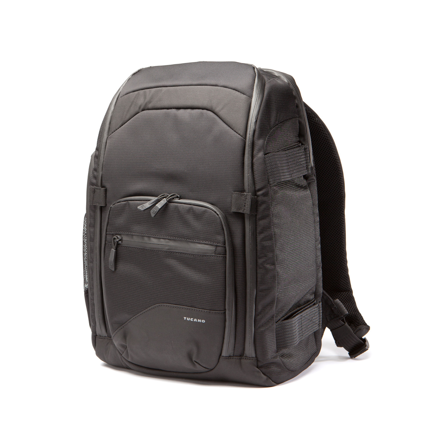 This Tech Plus DSLR camera and accessories backpack has a wide interior space, equipped with 3 large and 6 small mobile pads to customize to end users preference, store and protect your DSLR camera, spare lens and flash light. It's also equipped with a soft and smooth anti slip system that embraces the DSLR camera and avoids shocks during transportation. With a double external pocket for small accessories, internal pockets for memory cards and spare batteries, and an external mesh side pocket for accessories or water bottle, it has everything you need to get all your gear, including double velcro regulated loop on the other side to carry your tripod stand. The soft and padded shoulder straps are completely adjustable and secured on the front side by a fastex clip to enhance comfort. Tailor made rain cover and waterproof zippers complete this full optional backpack.