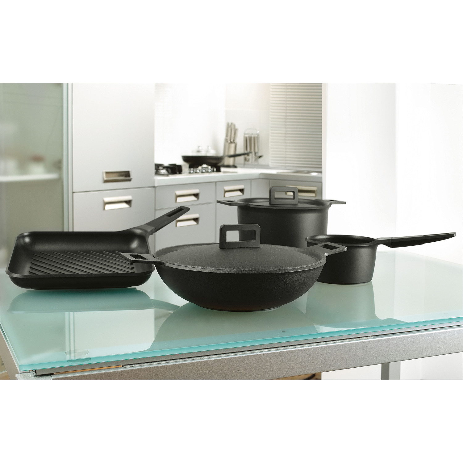 This elegant, modern Square Grill pan is perfect for indoor grilling - even if your guests are watching! Molded from a thick, continuous die-cast aluminum alloy, the square grill has a soft-grip, heat-resistant handle on the corner for better balance.