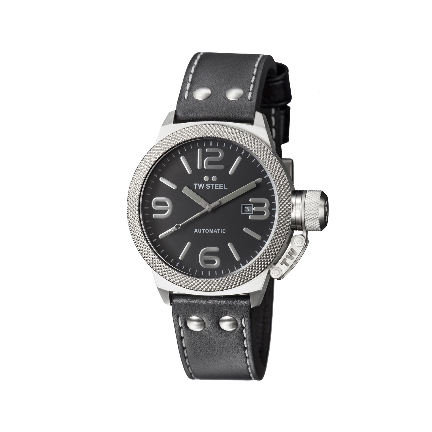 The Canteen was the first design to hit the market and remains the boss as the number one collection in TW Steel's history. Defined by the signature hook/crown cap and two steel dots on the leather strap, it’s an instantly recognizable design icon.