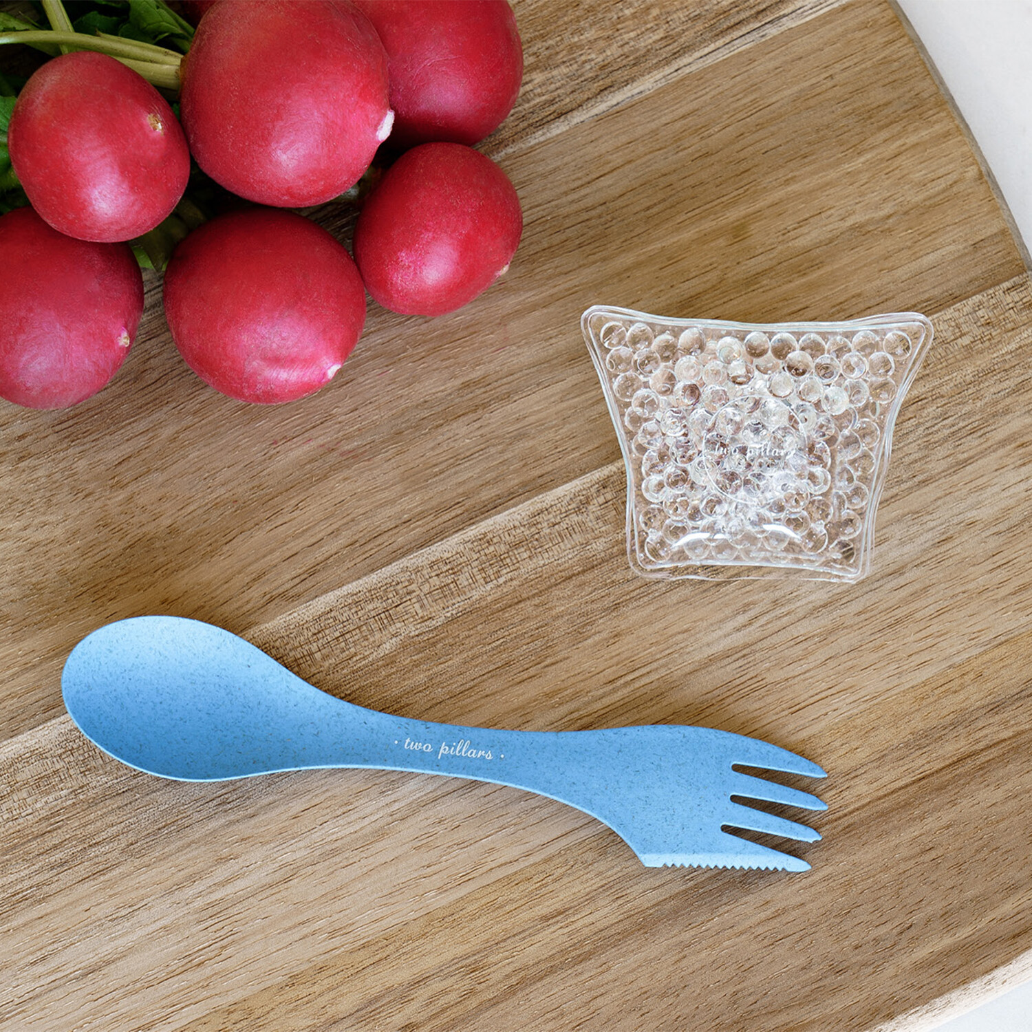 — Reusable Hot/Cold Pack + Bamboo Fiber Spork Can Be Stored In ZipBag's Front Storage Pouch