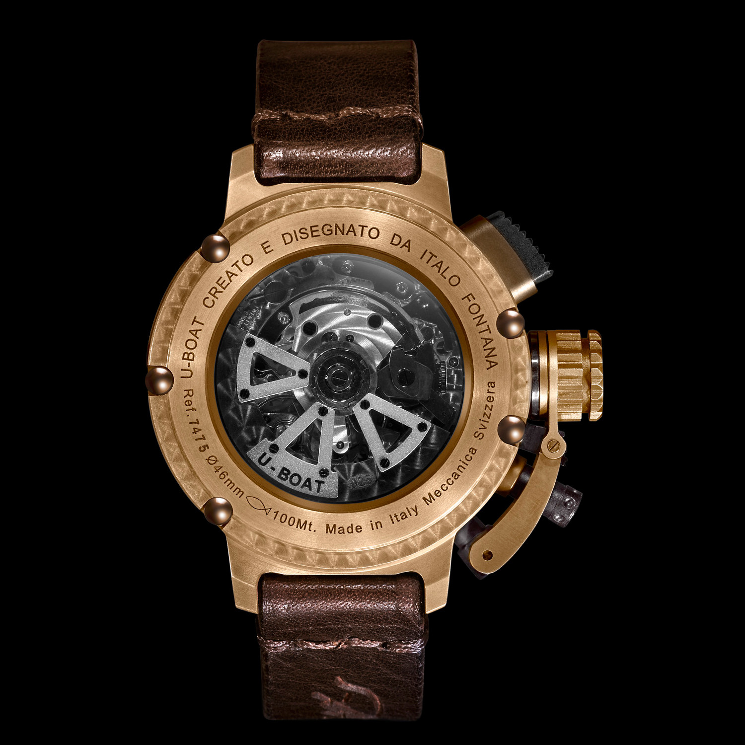 In Greek mythology, a Chimera is a beast with multiple parts; a hybrid creation, if you will. This U-Boat watch may not have horns, but it does combine unusual functions in creative ways. Two superimposed dials make the face multifunctional, while the bezel and the back of the case are locked together by external tubing and a customized key that ensures absolute water resistance. An oversized cup crown for an easy manipulation, secured on the carrure and positioned at 9 o’clock, completes this incredible piece.