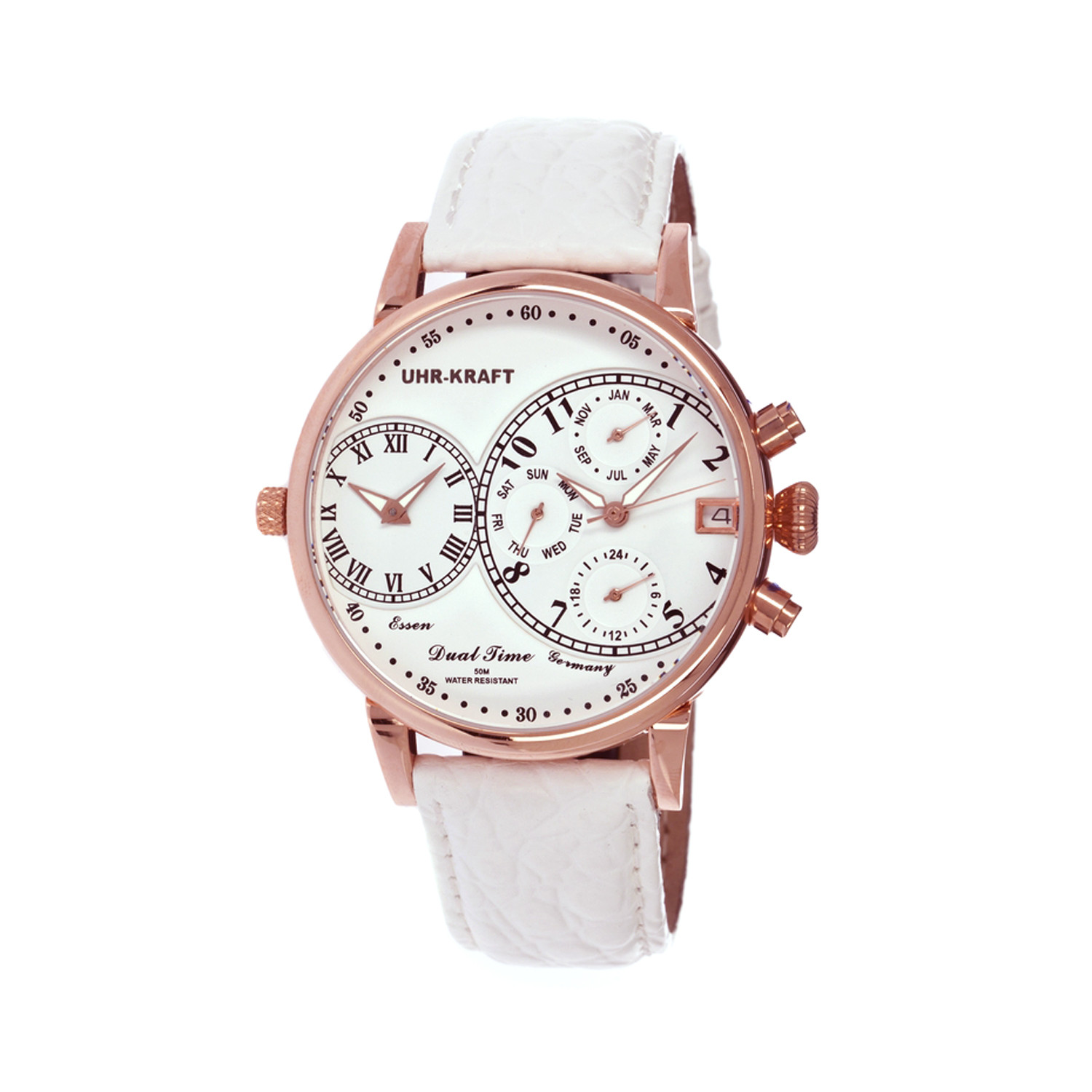 The Dualtimer features Swiss quartz movement, dual time zones, a stainless steel case, rose gold hands, a white analog dial and water resistance to 5 ATM. This is a lovely accent for everyday wear.
