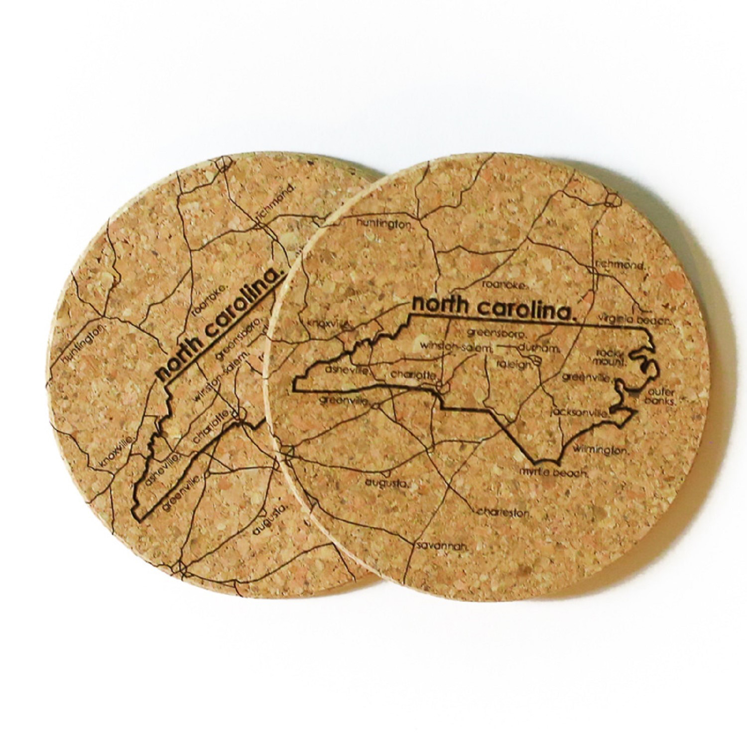 This set of natural cork coasters has been etched with the borders, roadways, and cities of your favorite state.