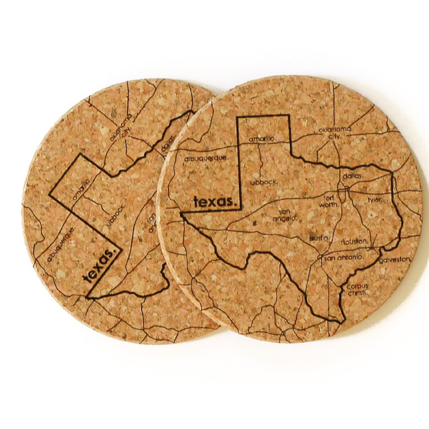 This set of natural cork coasters has been etched with the borders, roadways, and cities of your favorite state.