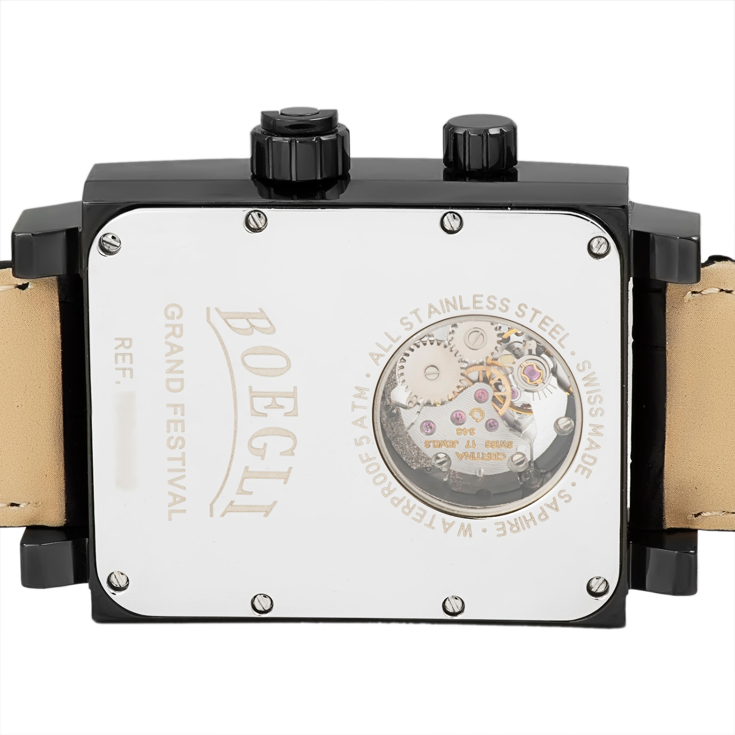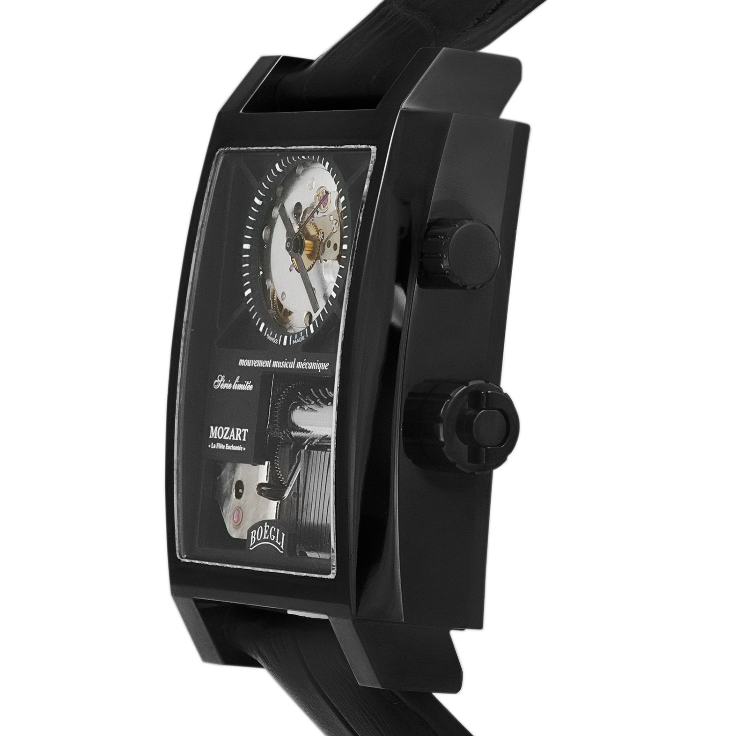 The new Grand Festival collection is living proof that it is possible to combine classical music and modern design. The steel case brings a young and dynamic touch to the very classical, and indeed occasionally baroque, collection of Boegli watches. The crown’s lever allows you to easily wind the mechanical musical movement, which plays a selection from Mozart's vast repertoire.