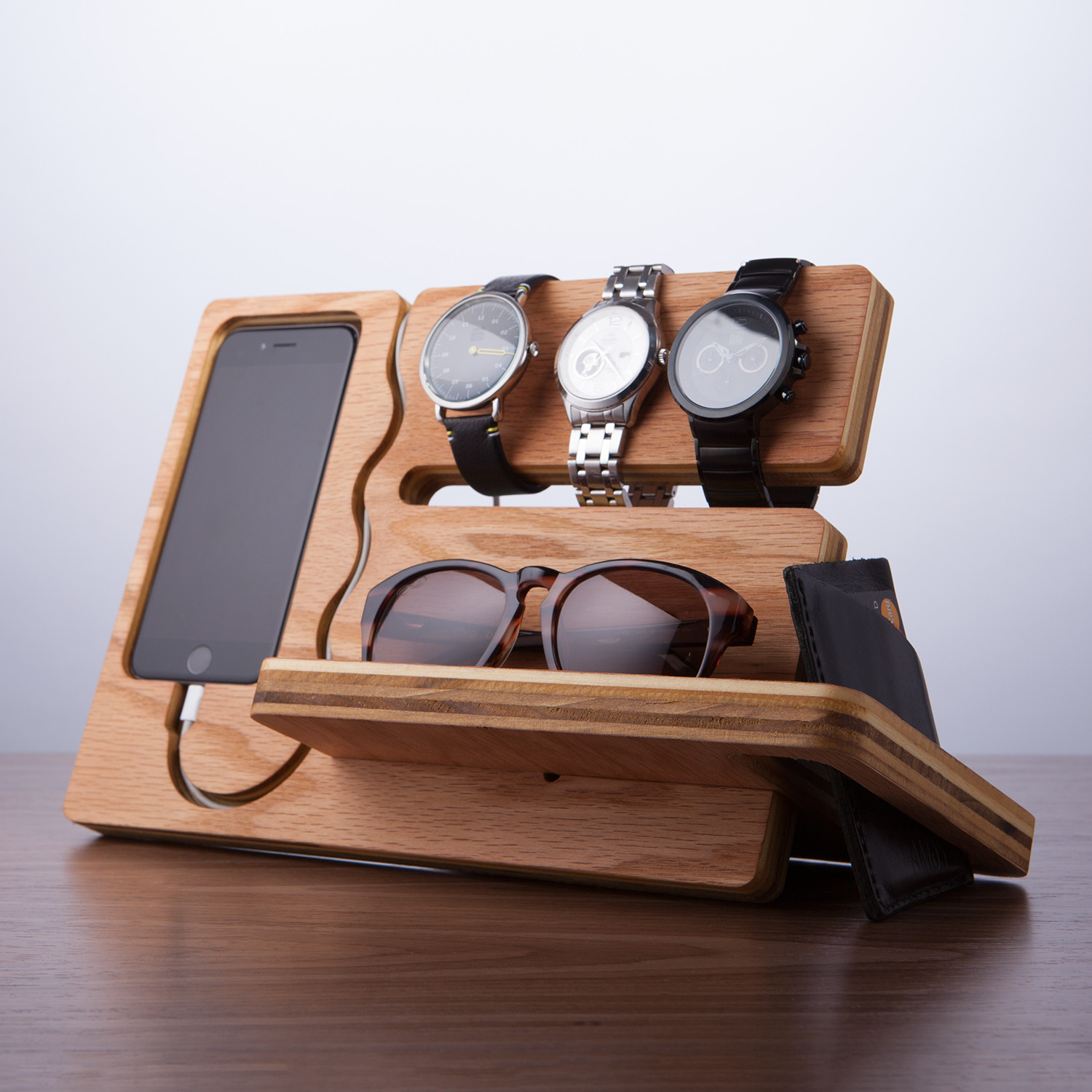 The Watch and Eye Dock is a minimalistic and feature-rich solution to both charge and display your iPhone or Samsung Galaxy. It boasts an integrated slot that can keep 3 to 4 watches at the ready. A carved pocket in the base can store eyeglasses, sunglasses, or other items you may carry in your daily life. A slot to the side can securely store a wallet or check book. Additional storage can be found in the rear of the dock for keys or change etc. As with most of my designs, you have access to all of your iPhone's buttons and functions while it is charging. This dock was designed for an iPhone 4, 4S, or 5, and an array of Samsung Galaxies. Curved wire path allows the phone and wire to be removed without disrupting the dock/valet. To assemble, slip the shelf in to the dock. No tools are required.