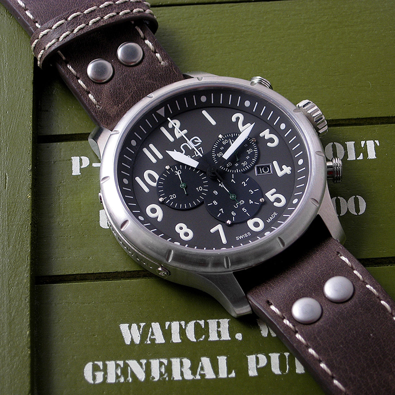 The P-47 Thunderbolt Chronograph is a pilot's big chronograph watch, dedicated to one of the most legendary and successful aircraft of all time, the P-47 Thunderbolt. Designed by Georgian immigrant Alexander Kartveli, the design has been paid special attention in this watch, with sub-dials that looks like a plane's dashboard and are attached to the main dial by screws. The round metal dial hosts luminous Arabic numerals at each hour position, and as regards to the chronometer’s hands and indexes, they are identical to the real P-47 cockpit clock WALTHAM 8 day hands and indexes, making it the perfect pilot's watch for your wrist.