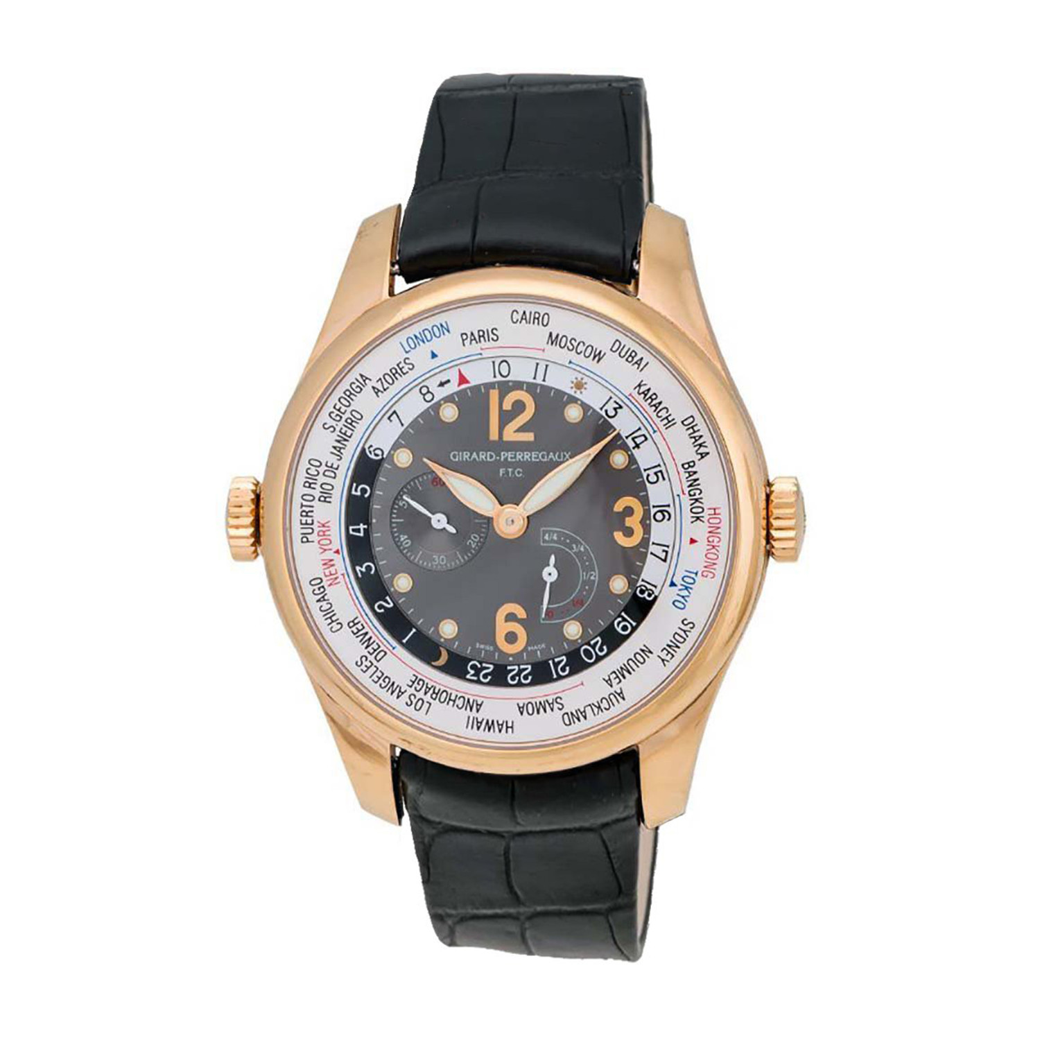 The Girard Perregaux WW.TC Financial World Timer Power Reserve Automatic is a stunning, complex timepiece that is at the top of many watch-collector's wishlists. The “ww.tc” of the watch’s name stands for “world-wide time control.” As such, various world cities are displayed, as is a second ring of hours to read the time in another time zone. The chronograph function includes a 30-minute counter at 9 o’clock, a 12-hour counter at 6 o’clock, and there is a subsidiary seconds at 3 o’clock and an easy-to-see orange center hand. It also has a convenient world-wide time control function.